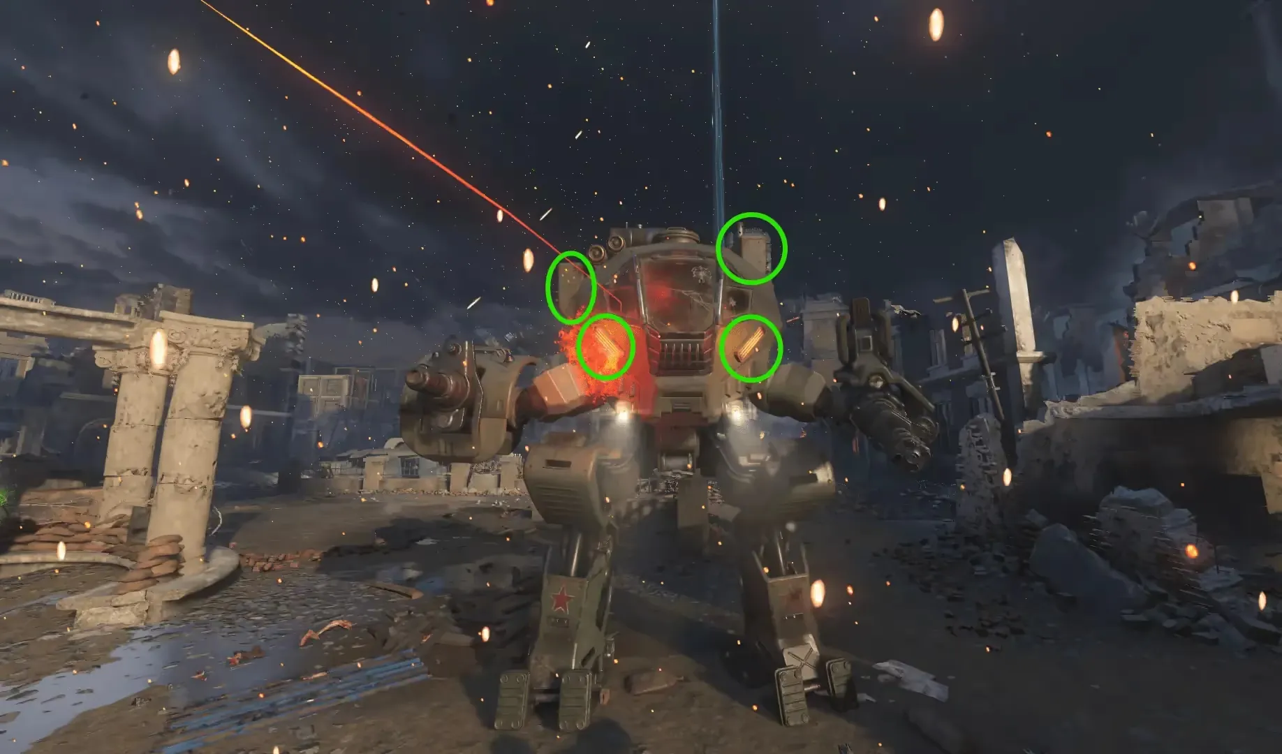 You must shoot four different weak points on the mech to defeat the Nikolai Mech. The two yellow lights are on the front of the mech, and the two power cores are on the top of the mech. The power cores are only visible when the Nikolai Mech attacks the player.