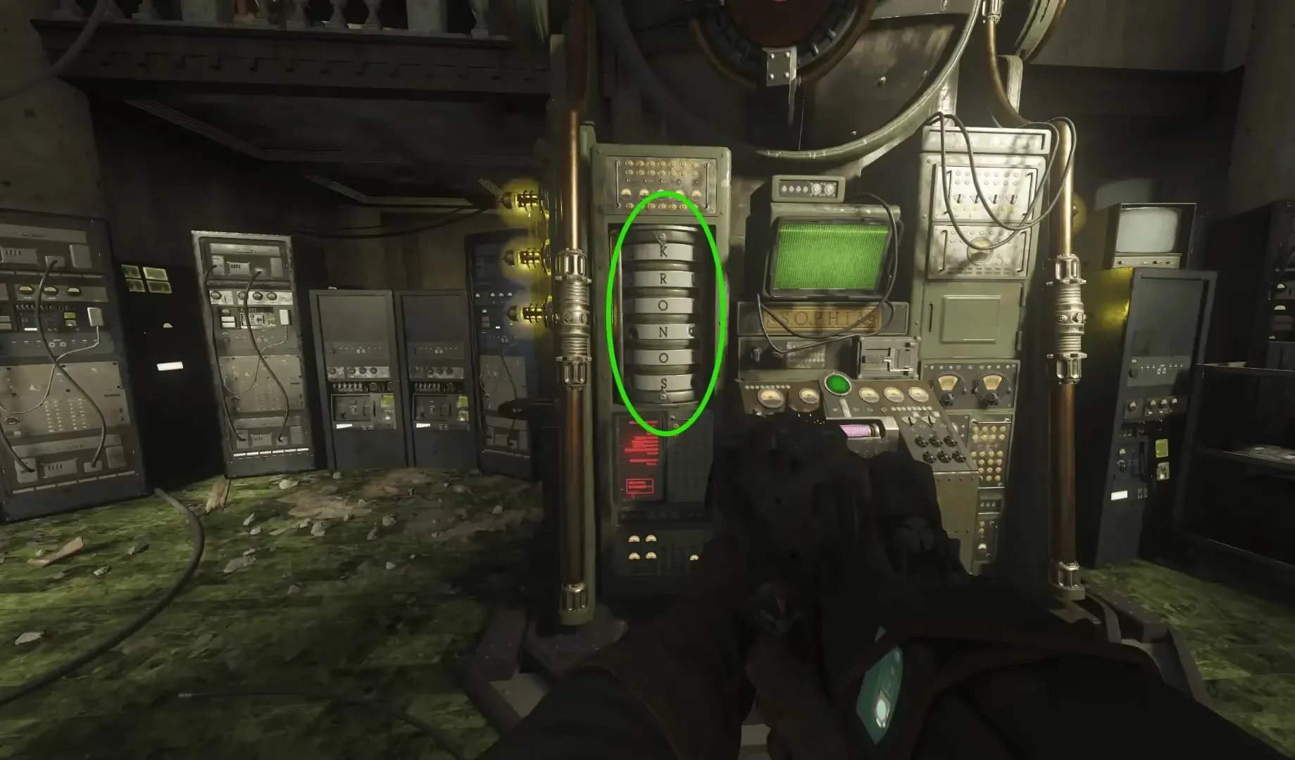 After returning the pink code cylinder to S.O.P.H.I.A., you must input the password KRONOS by shooting the individual letters on the wheel left of S.O.P.H.I.A. from top to bottom. Once entered, interact with S.O.P.H.I.A. to complete the step.