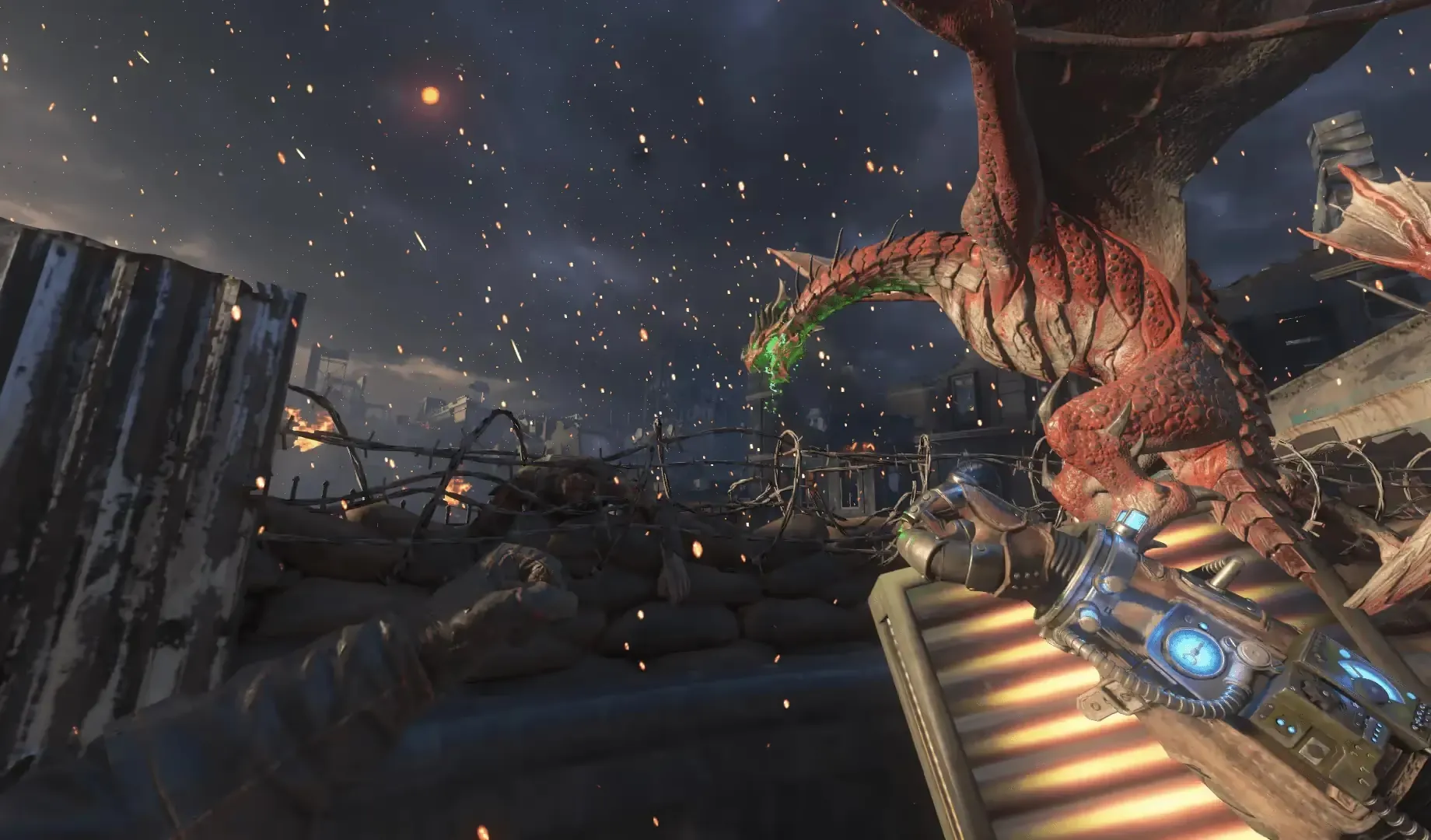 Afterward, Ultimis Nikolai will shoot a harpoon at the Dragon, revealing a weak point that you must shoot to damage the Dragon. You must repeat this three more times until the Dragon is defeated.