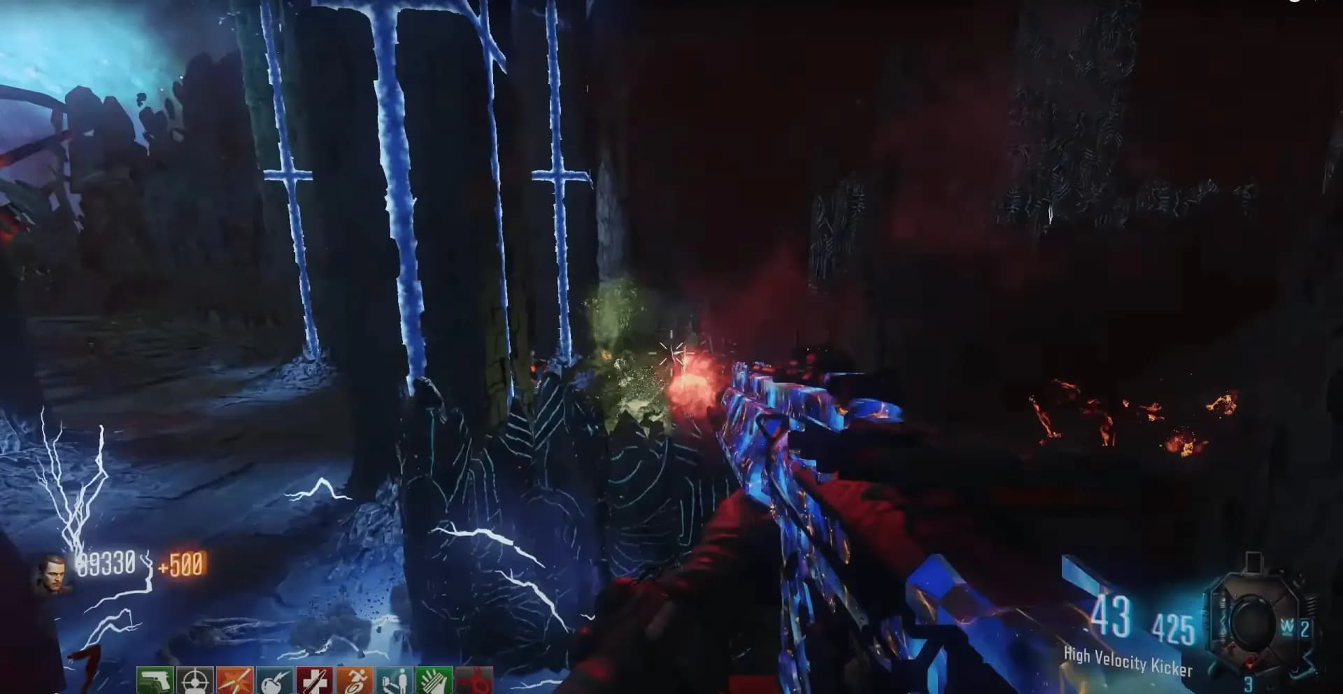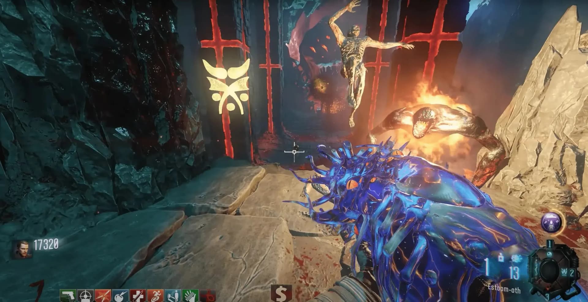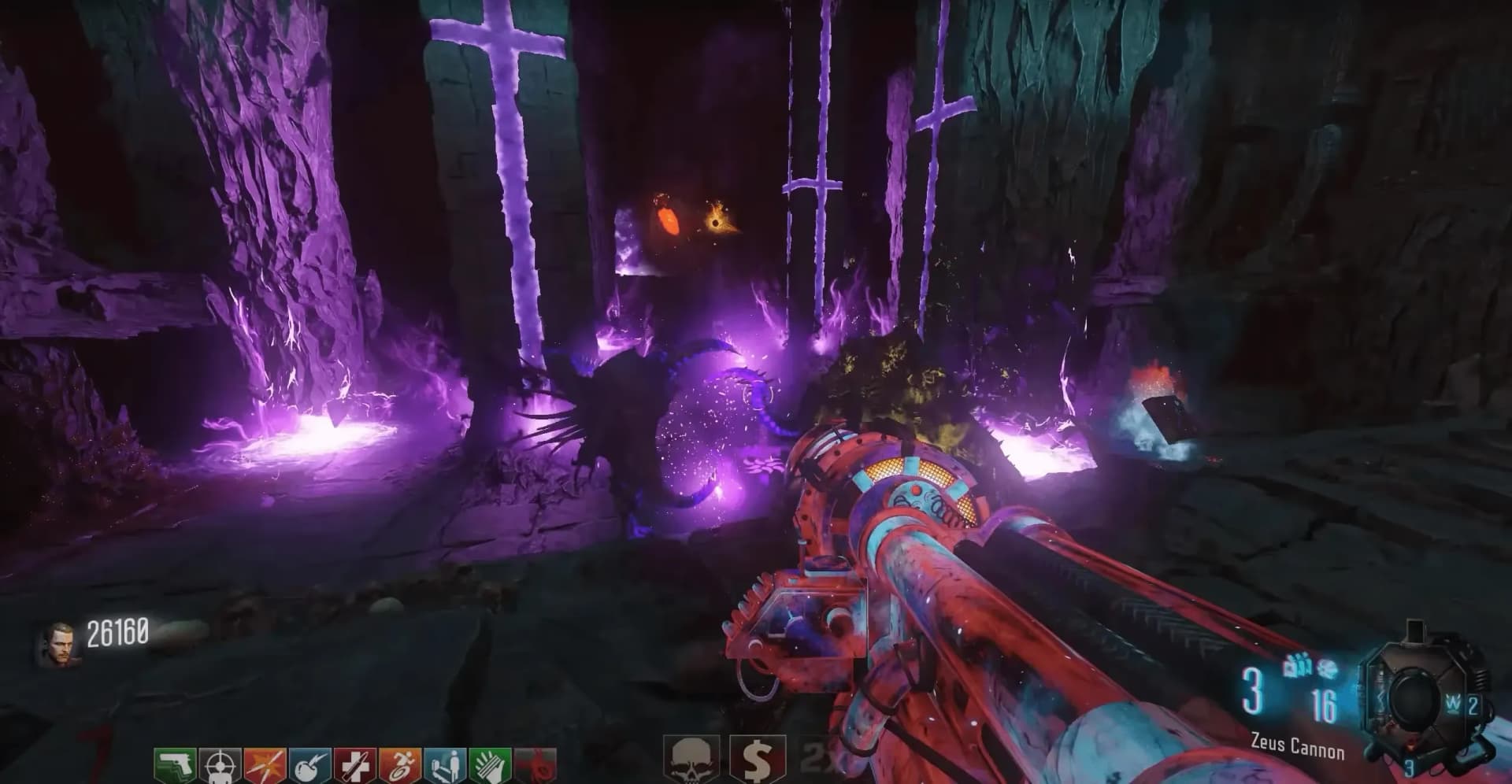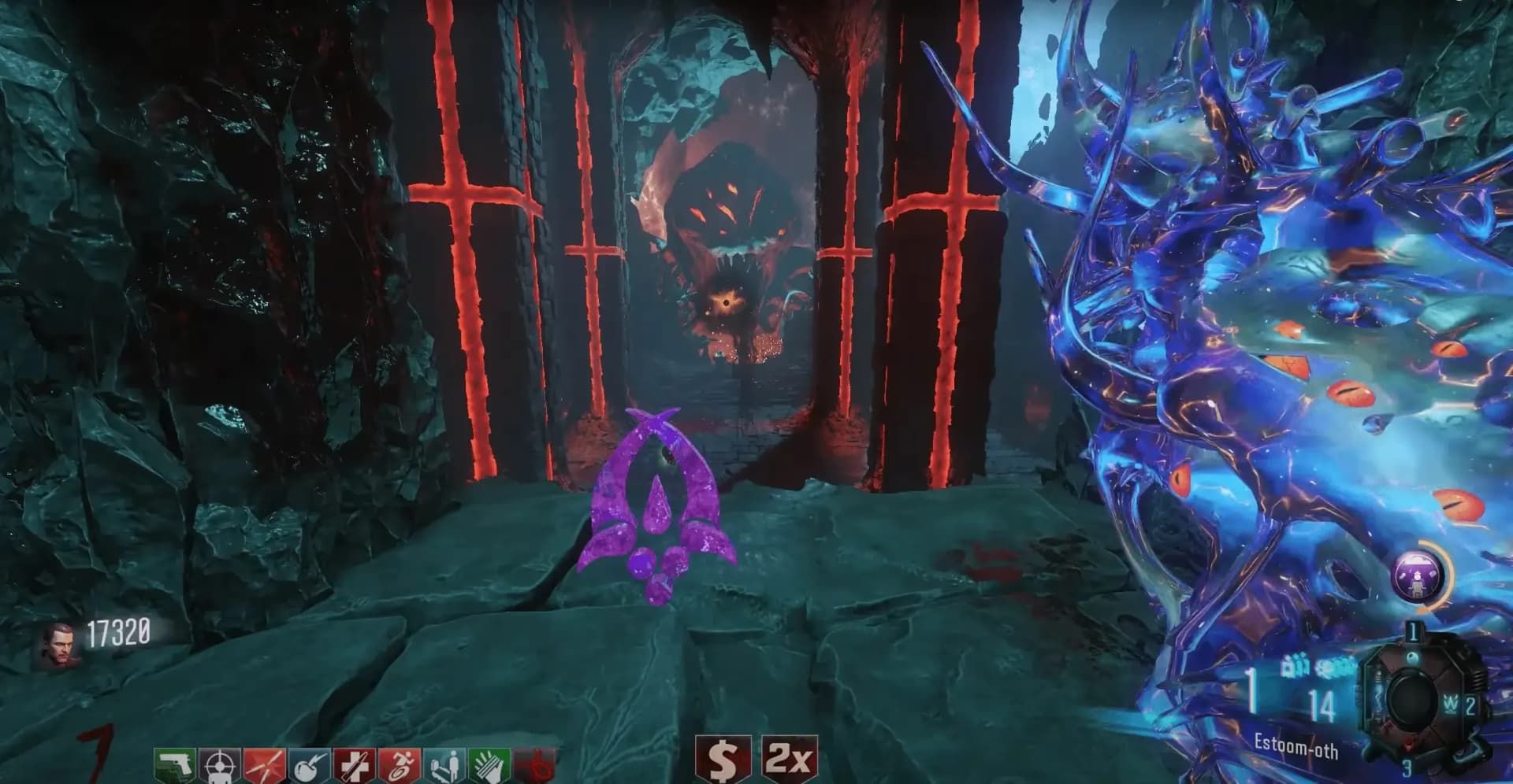 Once the correct order has been inputted, a Max Ammo will spawn where the symbols were, and another Max Ammo by the Kronorium, these power-ups will last until picked up. Two Margwa enemies will then spawn, and there will be four waves of two Margwa (Margwa count is increased by one each wave in co-op) with each wave bringing a randomized terrain shift to the boss arena: