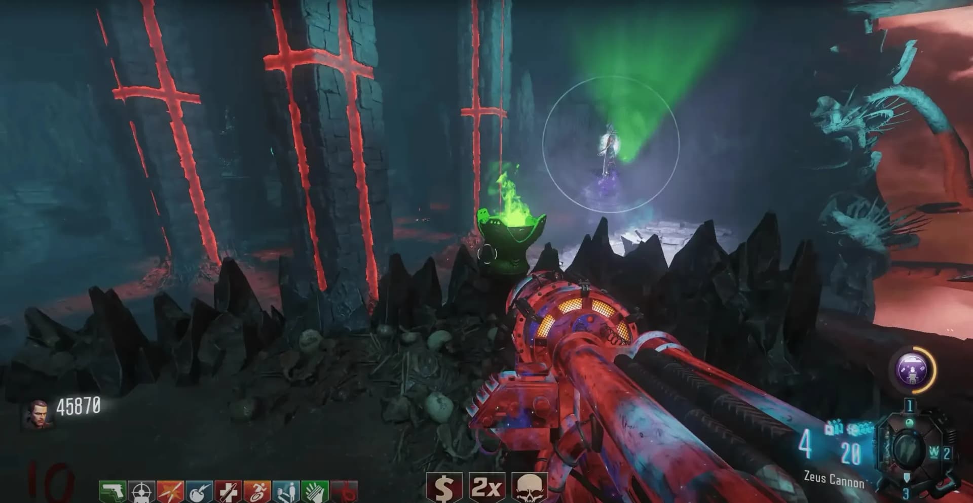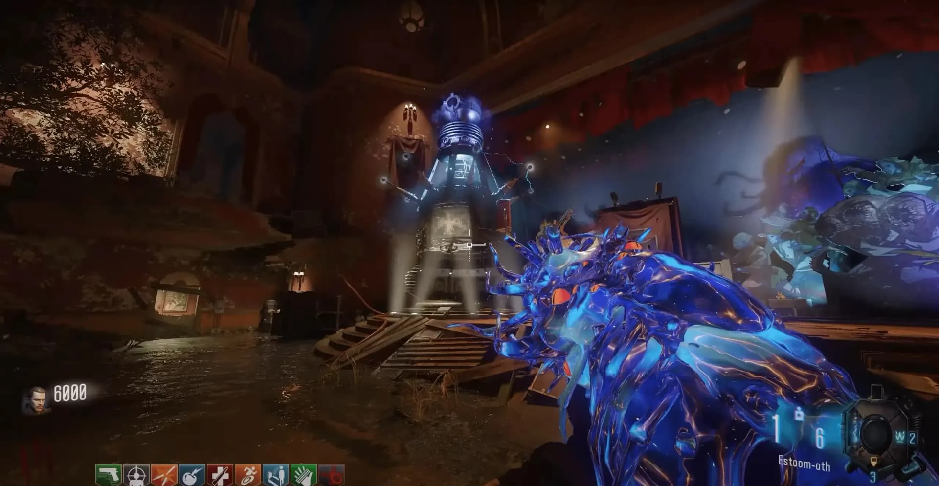 All players must enter the teleporter in Kino Der Toten teleporting them into the boss arena. The Shadowman will appear inside his shield over the Kronorium, with S.O.P.H.I.A. found transparent near the spawn point. Interact with any of the four green glowing pedestals in the four corners of the room, this will place the Summoning Key down and allow it to start collecting souls. You must kill 10 zombies near the Summoning Key to charge it with souls.