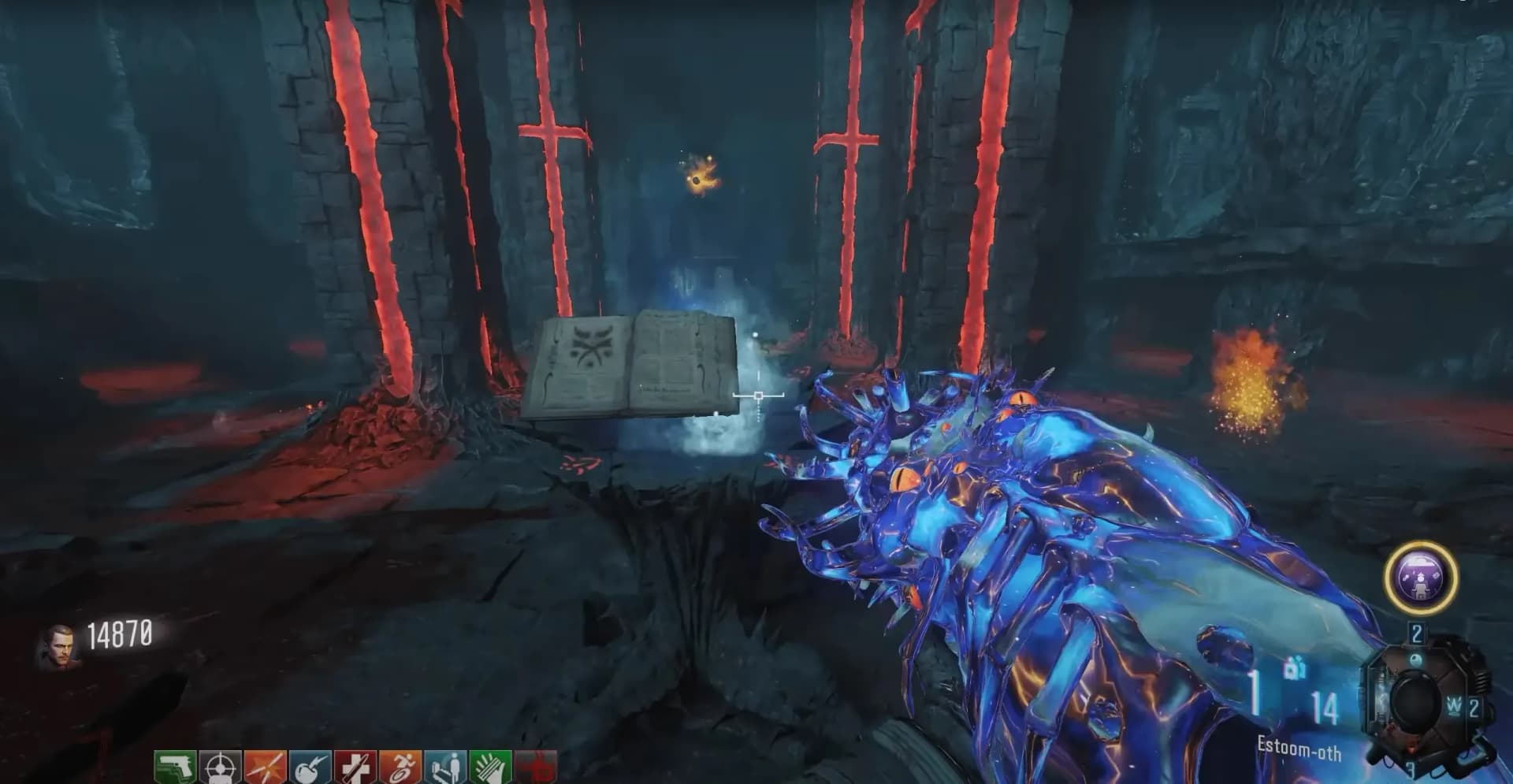 Once fully prepared, all players must stand on the glowing purple circle in the center of the Projector Room in Kino Der Toten, teleporting you to the boss arena. Head to the pedestal in front of the Apothicon head and interact with the Kronorium; this will cause it to flip through four of its pages, revealing the four Rune of Creation symbols at random. You must remember the order the symbols were flipped through.