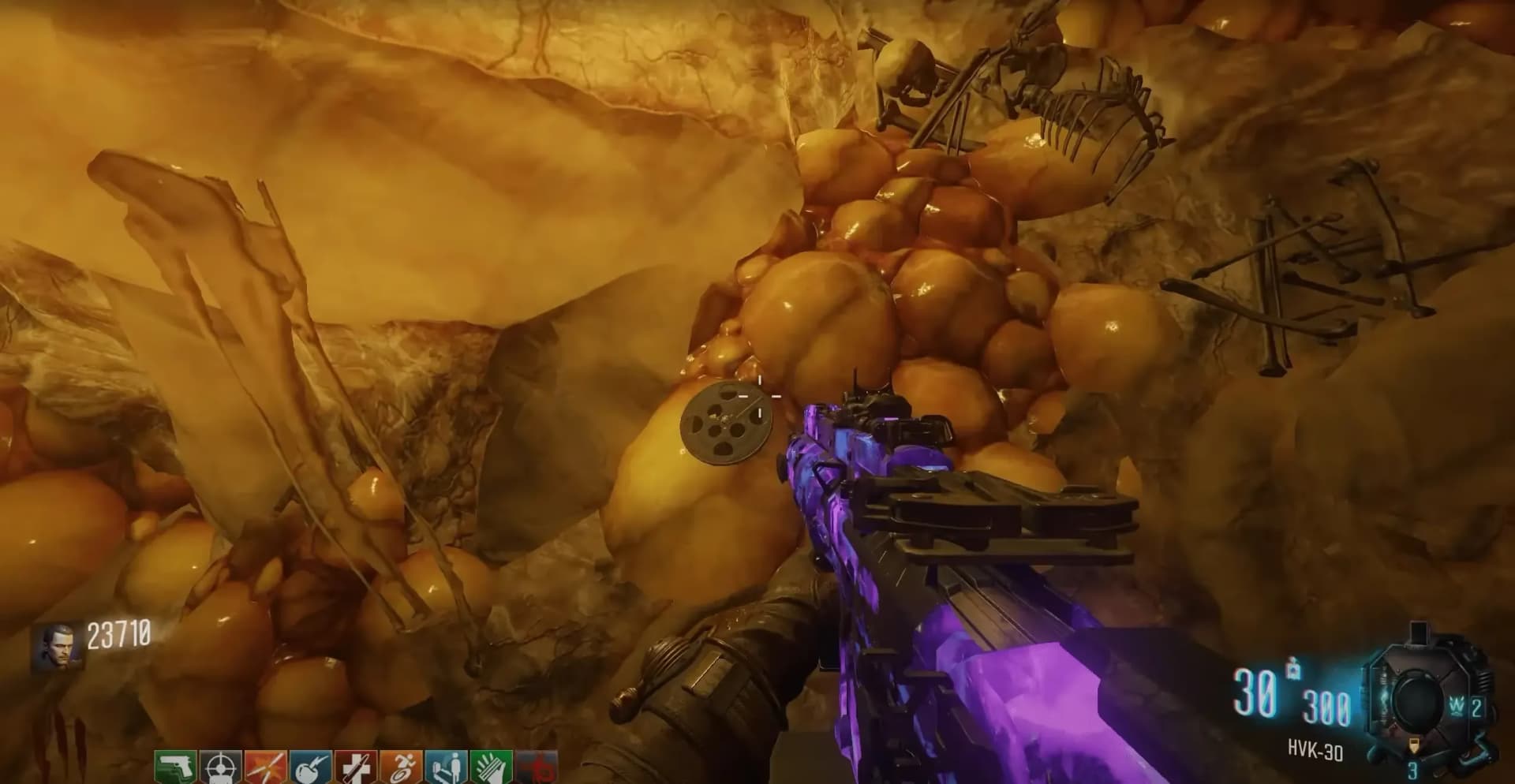 You must shoot six rocks scattered around the outside of the map with any Pack-a-Punched weapon except the Apothicon Servant, causing a bone of a skeleton to begin floating. You must collect this bone by shooting it with the Pack-a-Punched Apothicon Servant. The locations of the six rocks are: