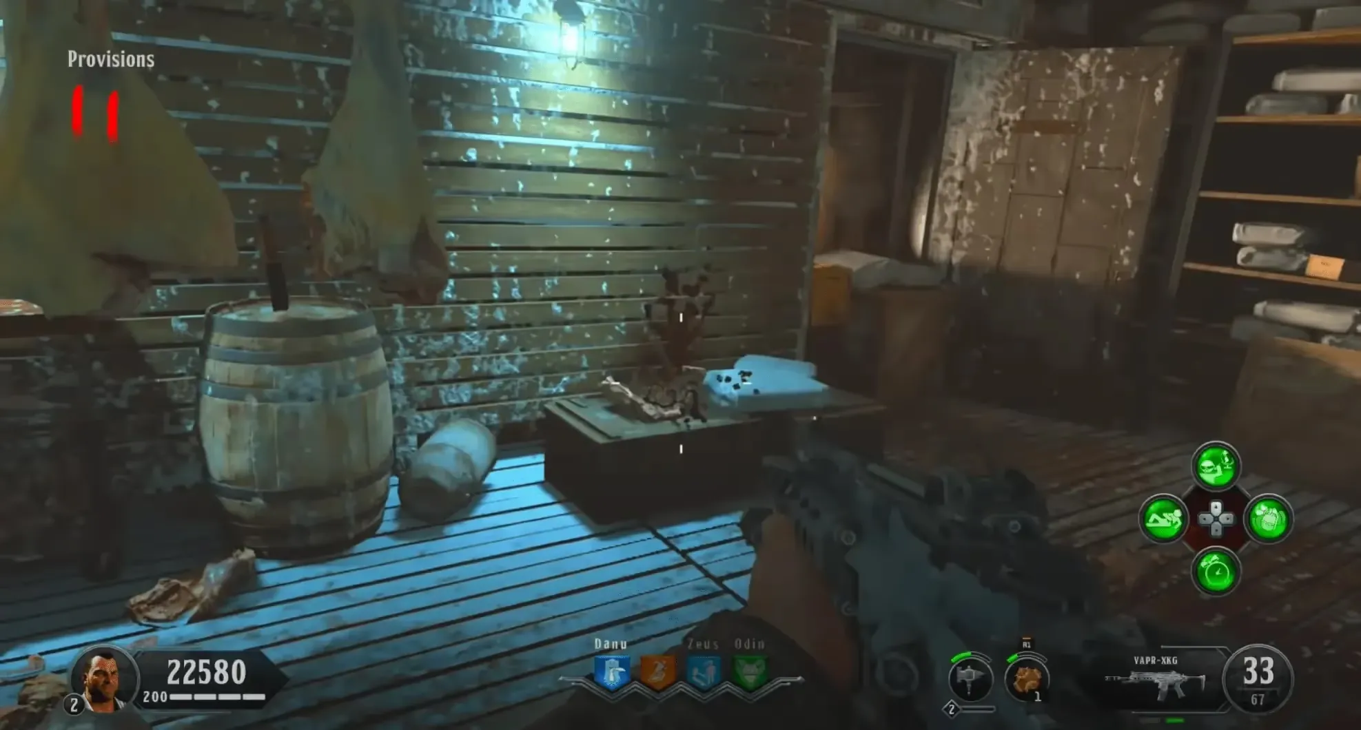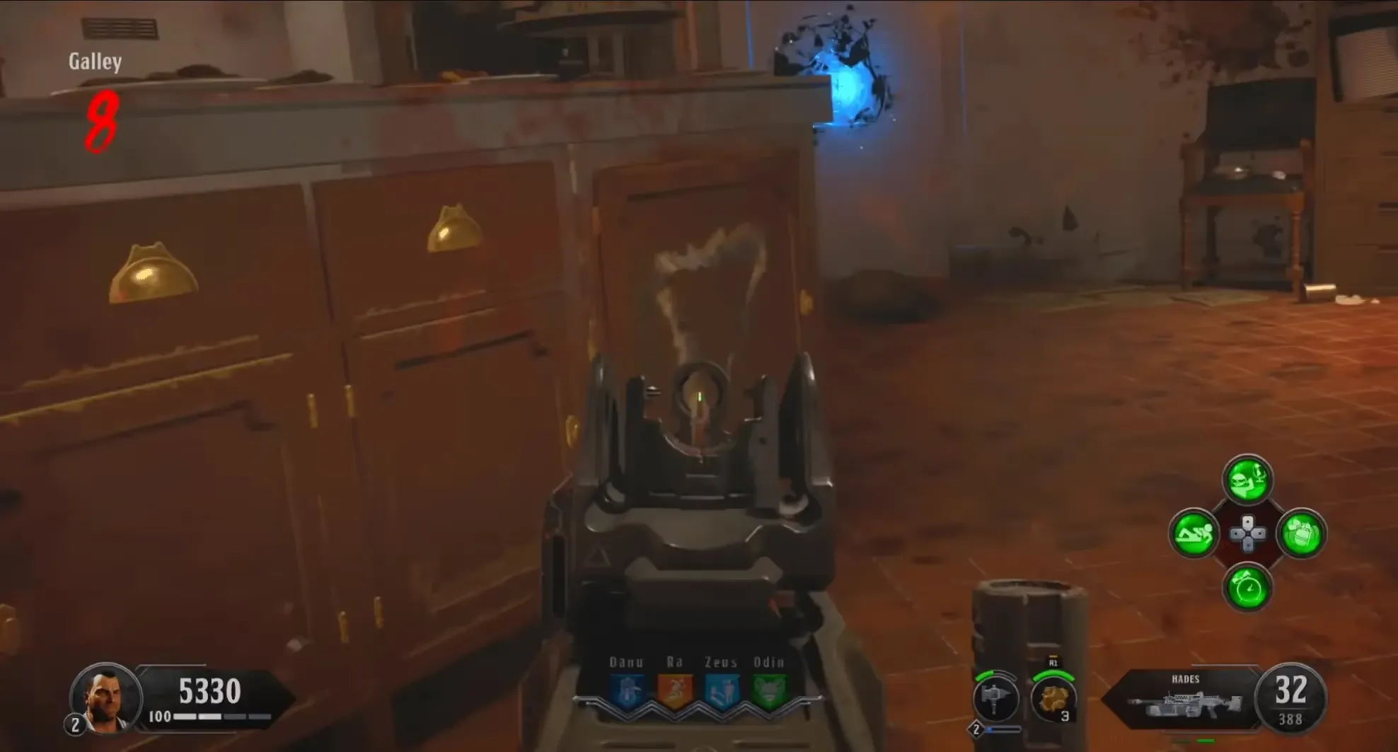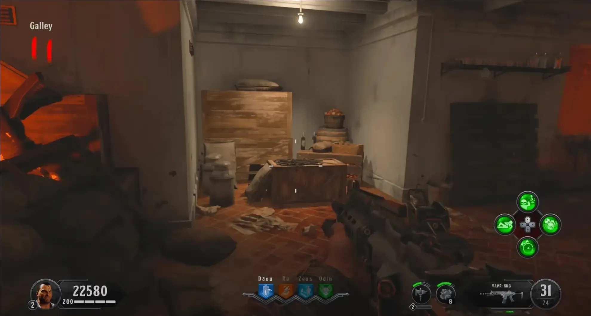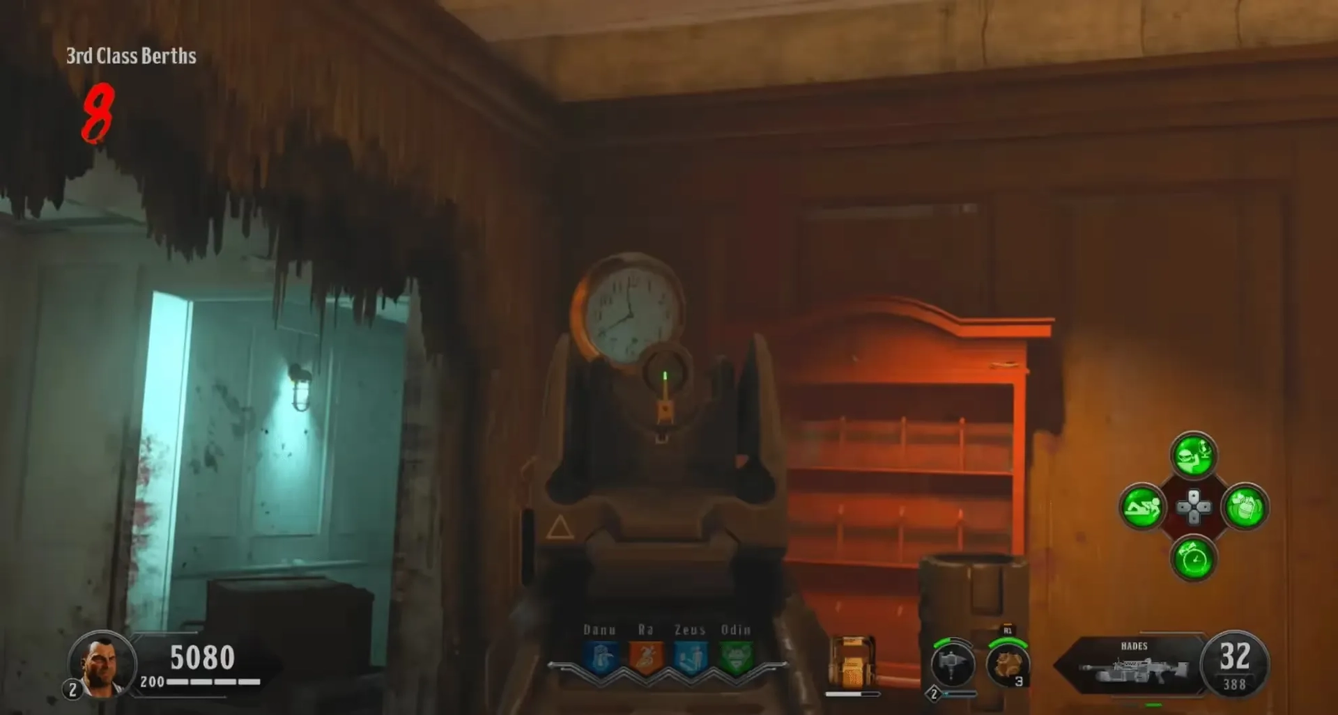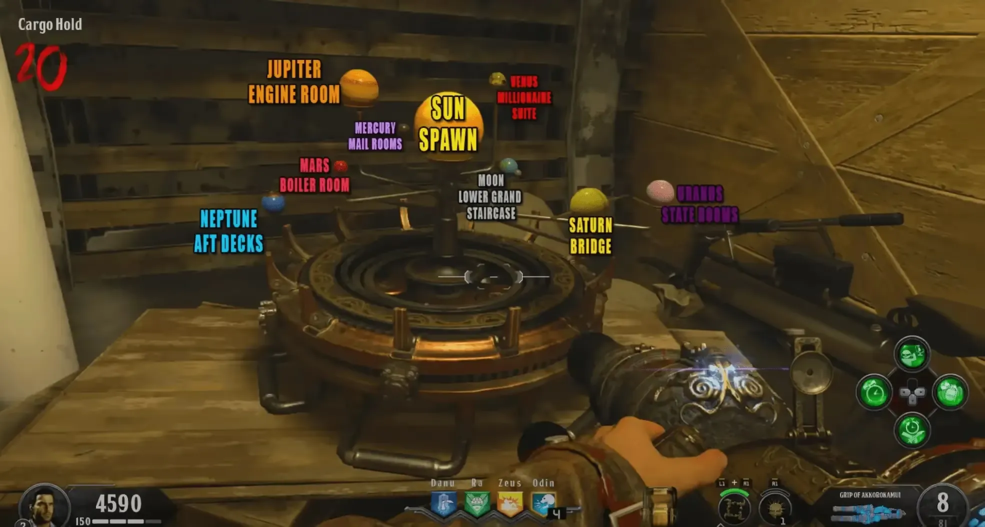Head to the Cargo Hold, if it is filled with water drain the water by interacting with the wheel next to the Pack-a-Punch pedestal. Near the front of the room on the left-hand wall when facing the portal, there is a solar system model on a crate. You must interact with this model to reveal the order of planets you must destroy and spawn in a lot of zombies. It is recommended to throw a Homunculus before interacting with this model so you can safely view the order.