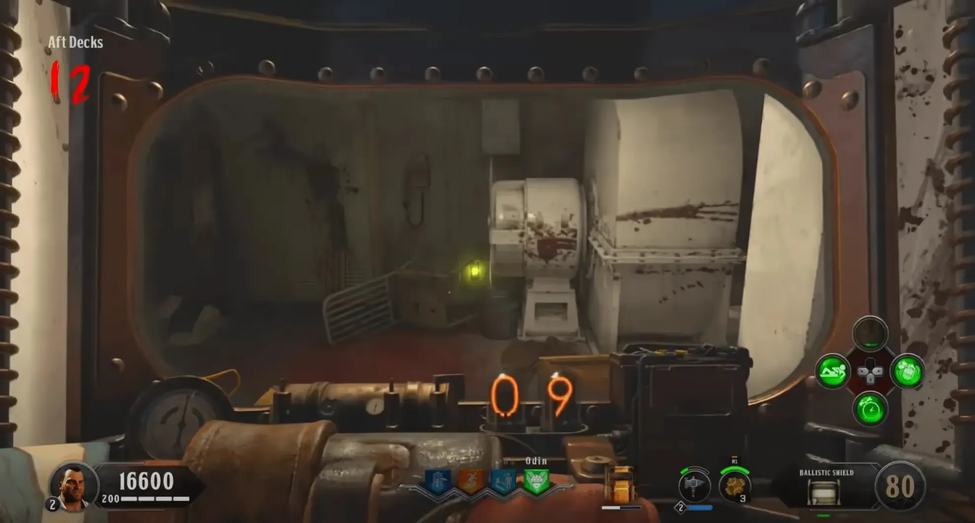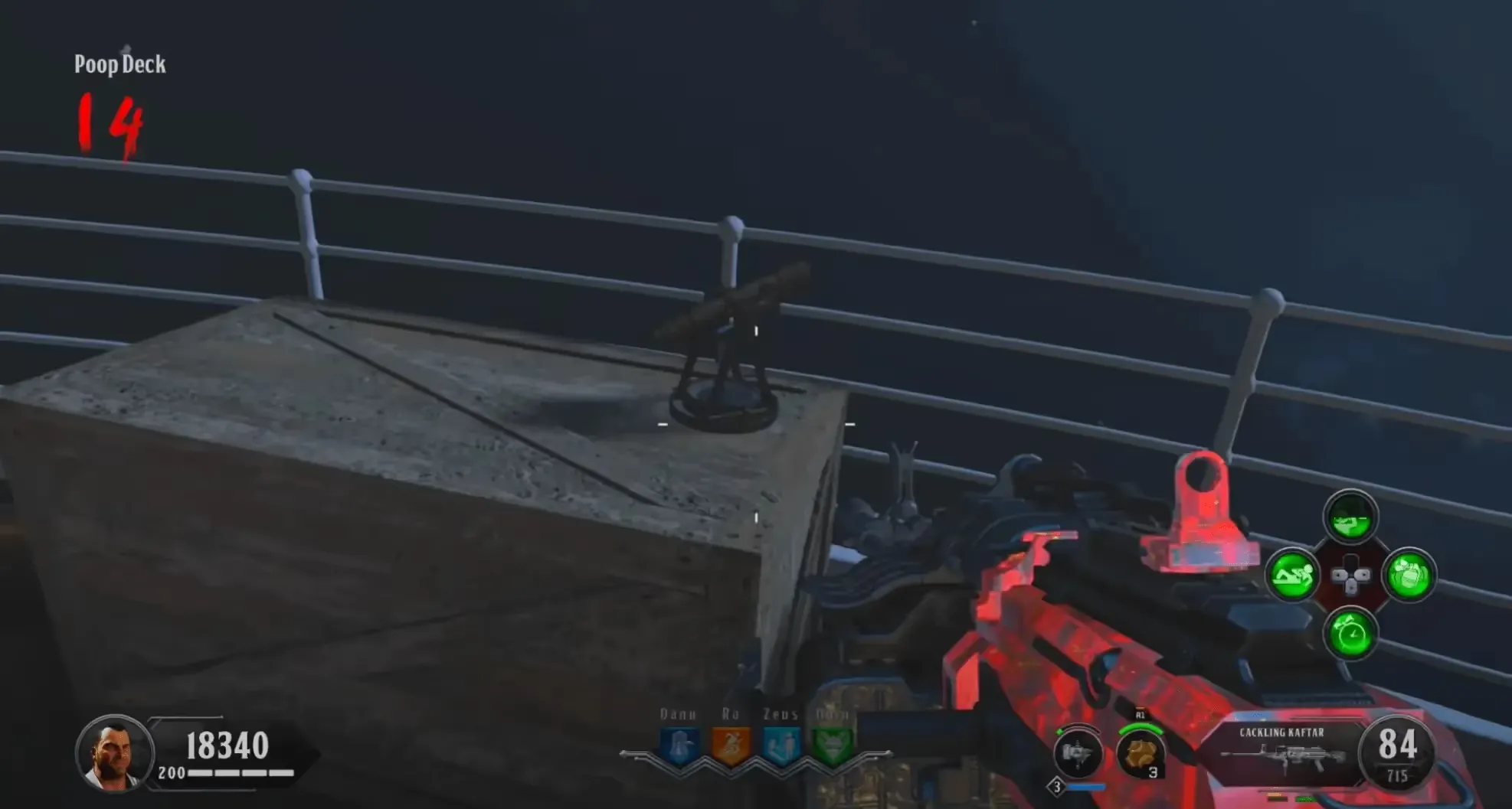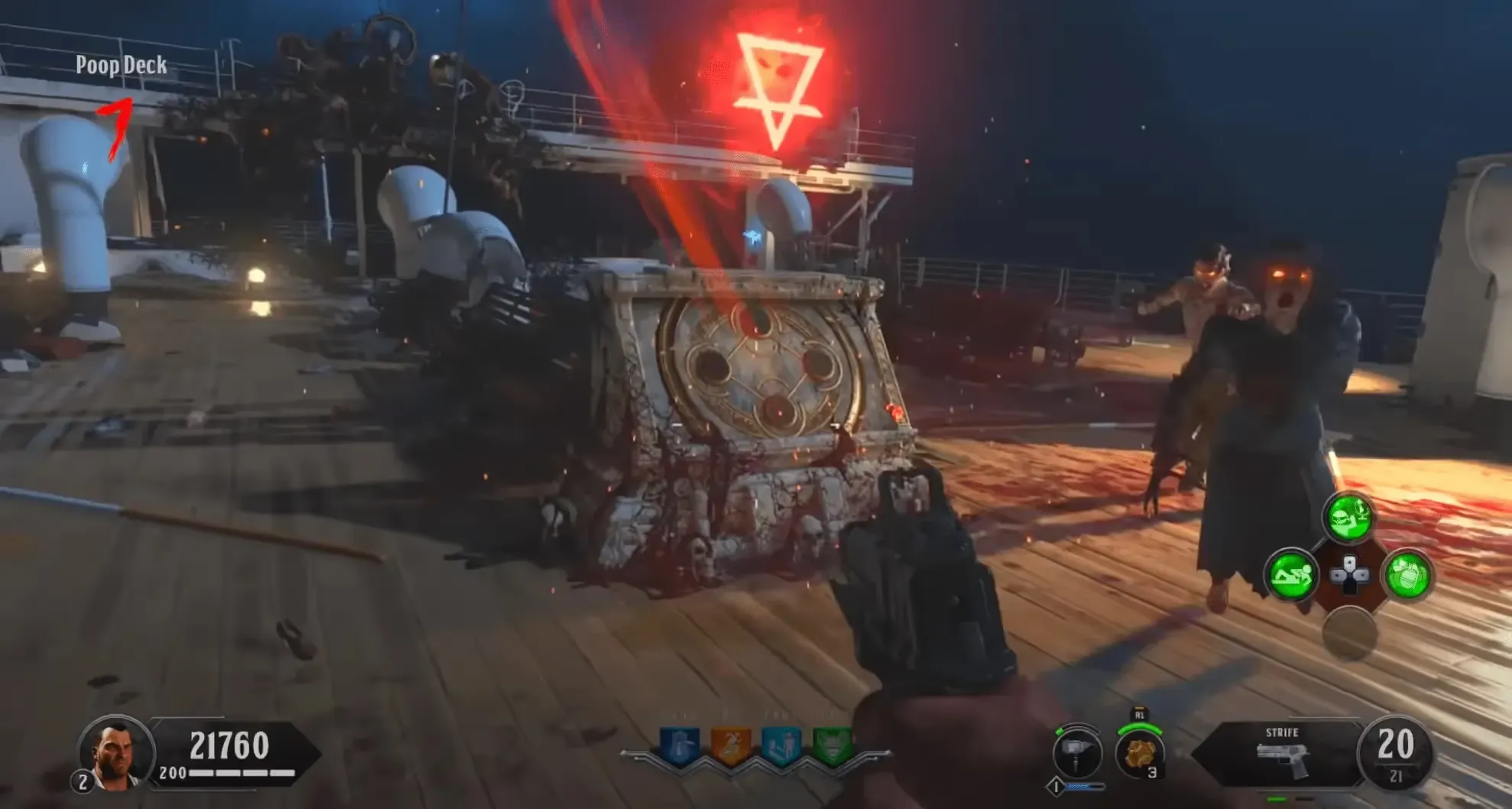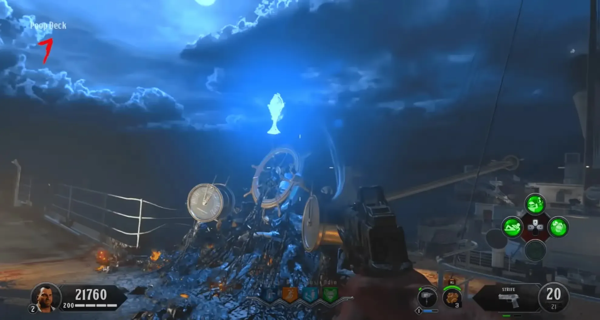 You will be teleported to the Poop Deck where you must survive against an onslaught of zombies, Poison Catalyst, and Blightfather zombies. If you have the Kraken, during this lockdown you can work toward the Decayed Kraken by killing the Poison Catalyst zombies with the Kraken until they drop a Poison Catalyst Heart. Once you see a white flash, the lockdown is complete, and you can grab the Max Ammo in the back of the Poop Deck and pick up the Sentinel Artifact.