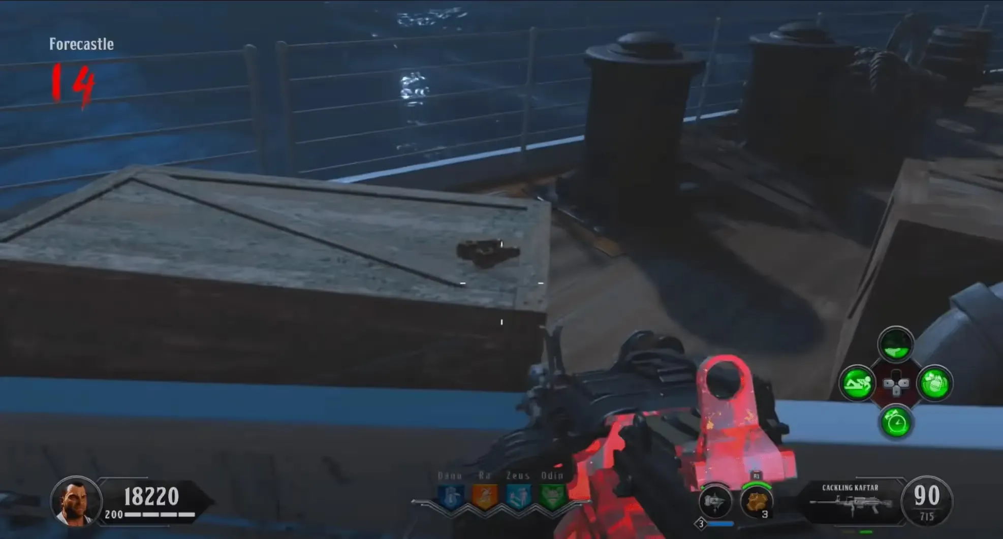 You will be teleported to the Boat Deck where you must survive against an onslaught of zombies, Lightning Catalyst, and Blightfather zombies. If you have the Kraken, during this lockdown you can work toward the Electric Kraken by killing the Lightning Catalyst zombies with the Kraken until they drop an Electric Catalyst Heart. Once you see a white flash, the lockdown is complete, and you can grab the Max Ammo in the center of the Boat Deck and pick up the Sentinel Artifact.