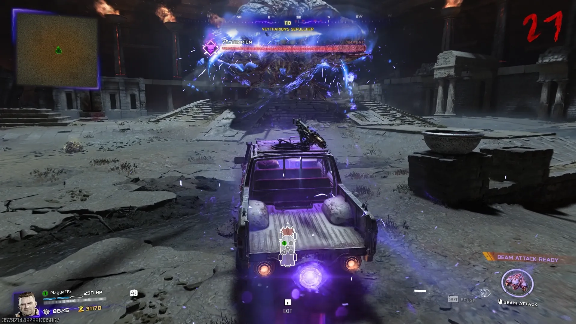 Rinse and repeat this process until Veytharion goes immune and start spinning like a bay-blade. This is the phase transition period, where you will need to wait for him to launch a purple beam of light onto the arena, which you need to drive through to supercharge Ol' Tessie, and then ram into Veytharion to knock off his shield.