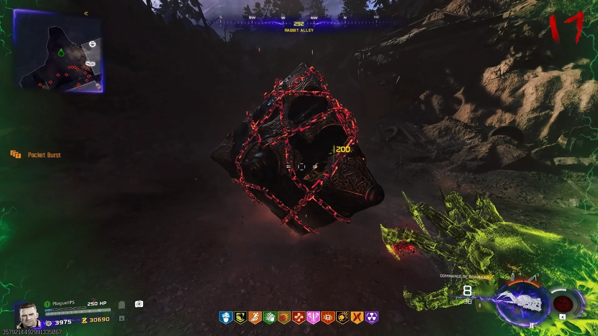Once you know your three symbols, input them into the cube, and confirm your selection by interacting with the eyeball, revealing the Necrofluid Gauntlet for you to claim. Once claimed, a small lockdown will begin, where you'll need to shoot all the green orbs with the Necrofluid Gauntlet and then reload to retract the spikes, pulling in the green orbs, once all green orbs are pulled in, the lockdown will end.
