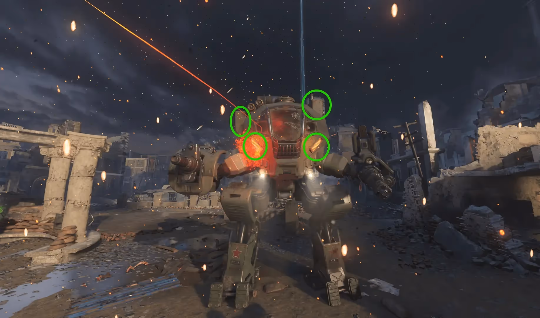 You must shoot four different weak points on the mech to defeat Nikolai. The two yellow lights are on the front of the mech, and the two power cores are on the top of the mech. The power cores are only visible when Nikolai attacks the player.