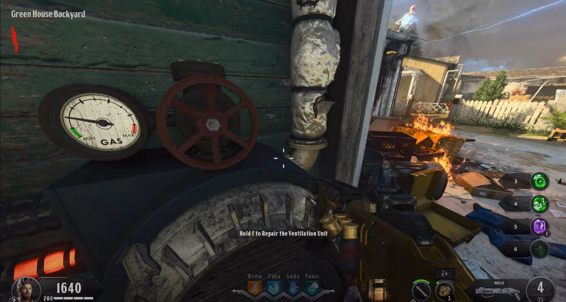Turn on the power in the Power House and head to the Generators area to activate the generator and initiate a lockdown. After the lockdown, four of the six houses around the map will be emitting a green gas (Nova 6 Gas), and you must repair the Ventilation Units in those houses by holding the interact button until the gauge is back to green.