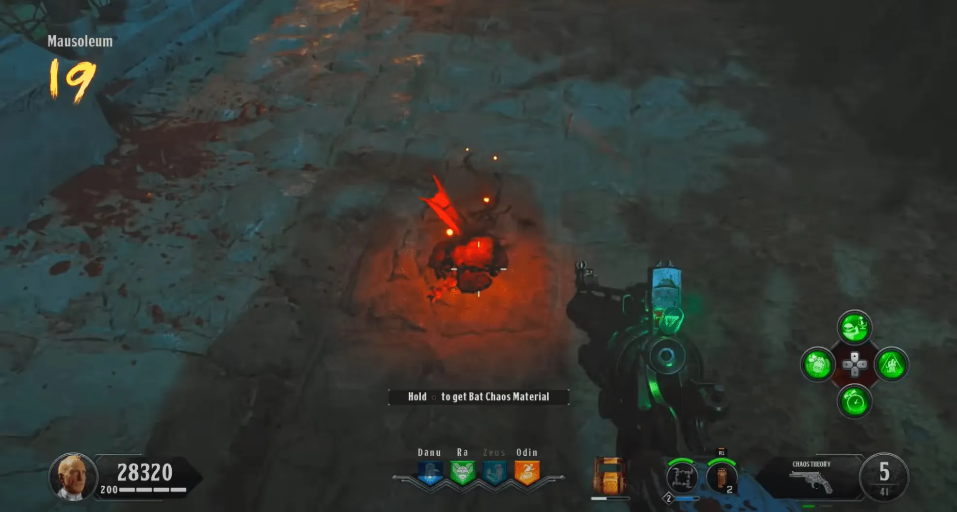 Interact with the tomb to summon a Nosferatu zombie that you must kill with the Chaos Theory. Killing this Nosferatu will drop a Nosferatu Chaos Material that you must pick up. This is the first of three materials needed for the upgrade.