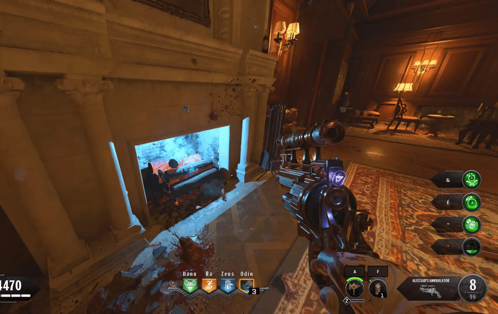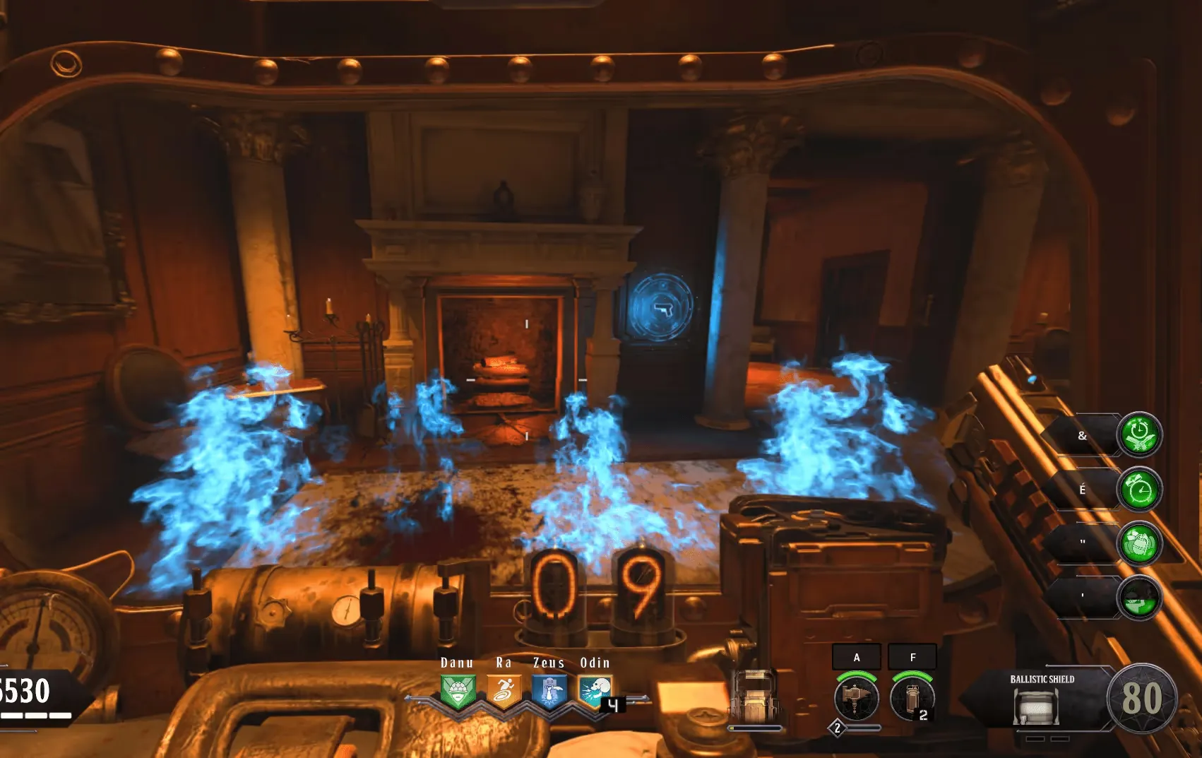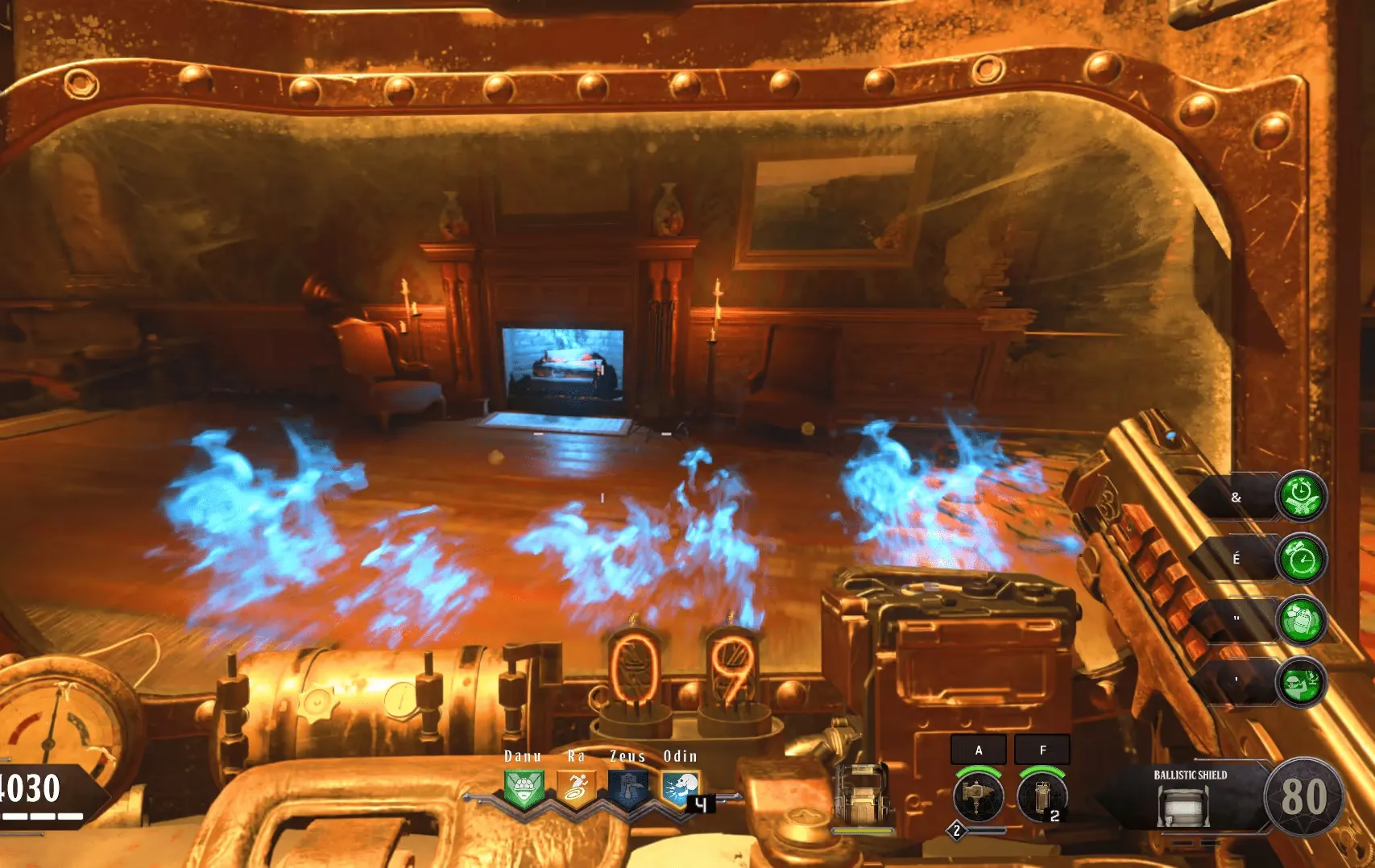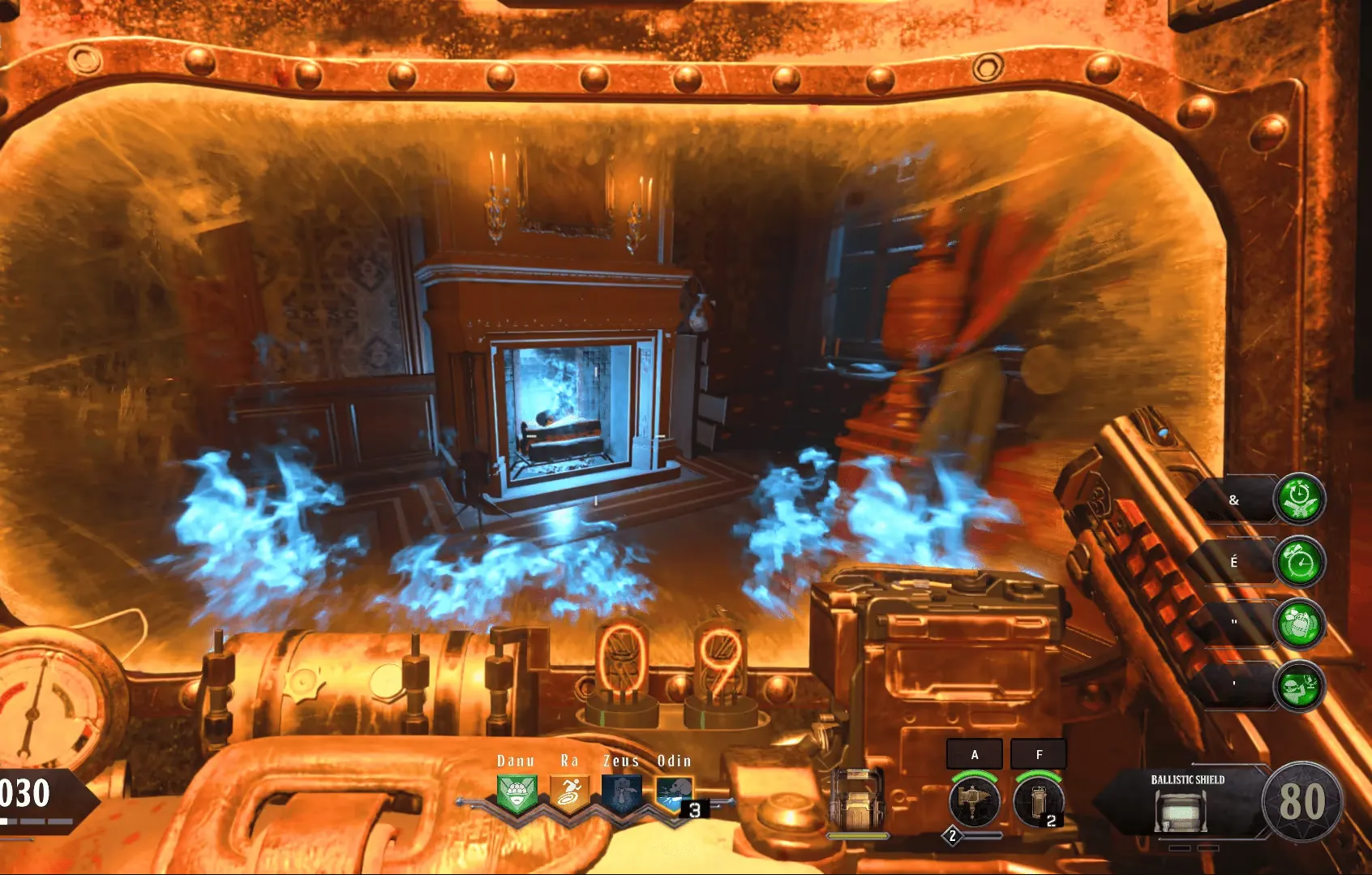 Head to the Library, turn on the Fire Trap, and shoot the flames with Alistair's Annihilator until the flames are blue. Once blue, pull out your shield and run through the flames to ignite your shield. You now need to melee four fireplaces within 45 seconds to turn them blue. This needs to be done for three sets of four fireplaces, each set rewarding you with a Gem.