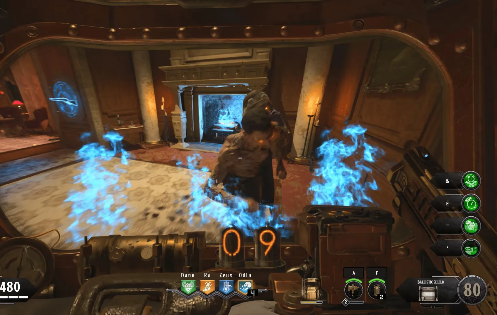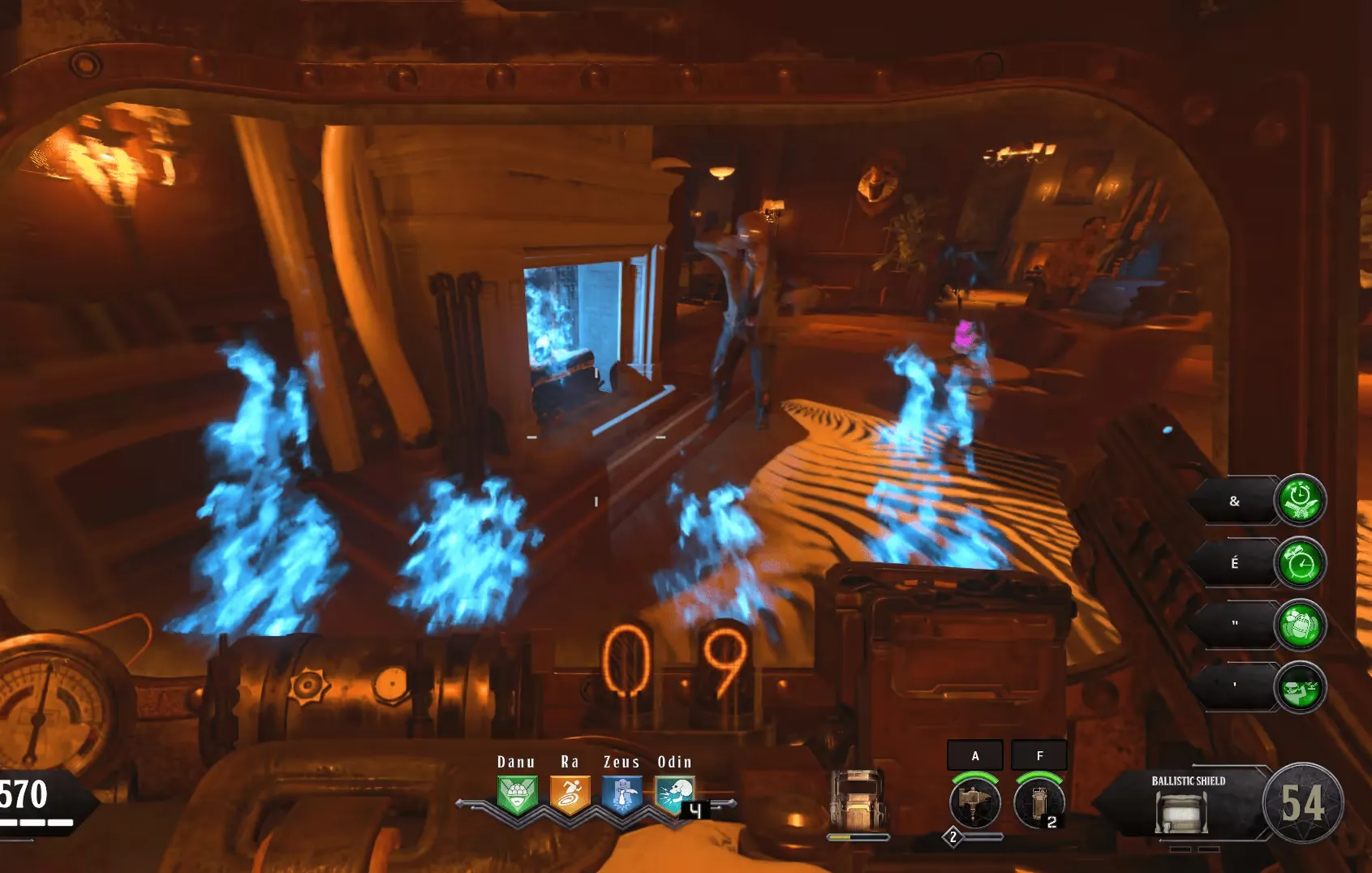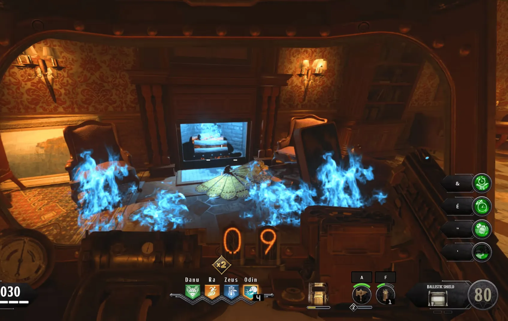 Head to the Library, turn on the Fire Trap, and shoot the flames with Alistair's Annihilator until the flames are blue. Once blue, pull out your shield and run through the flames to ignite your shield. You now need to melee four fireplaces within 45 seconds to turn them blue. This needs to be done for three sets of four fireplaces, each set rewarding you with a Gem.