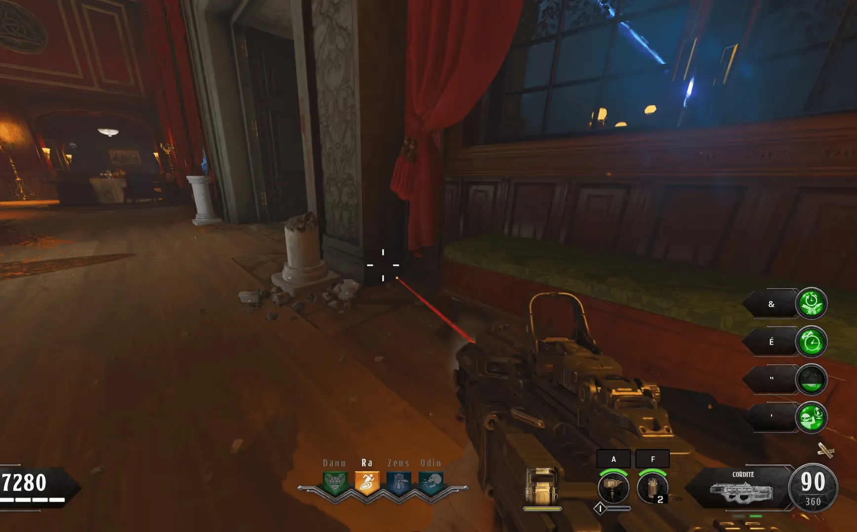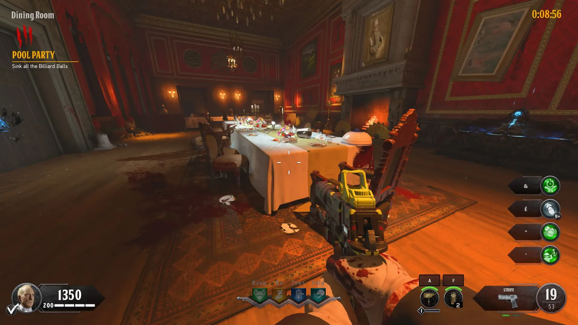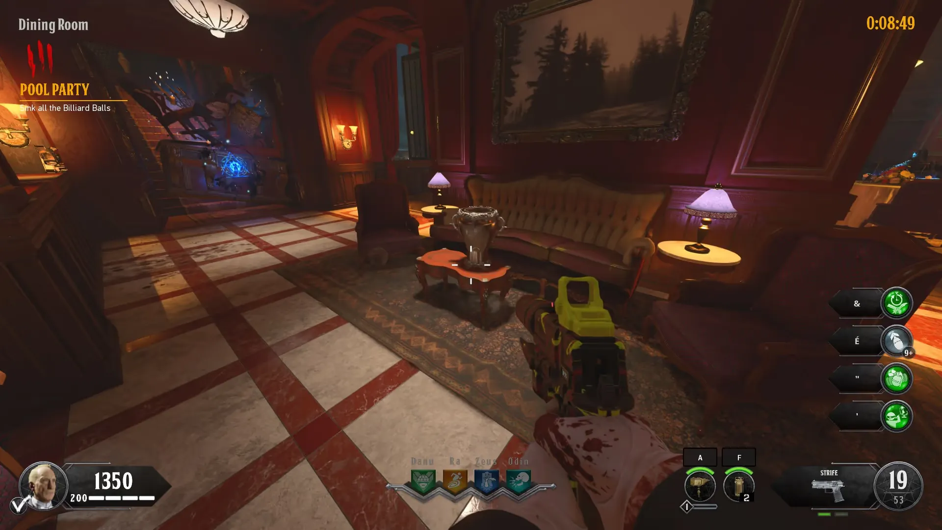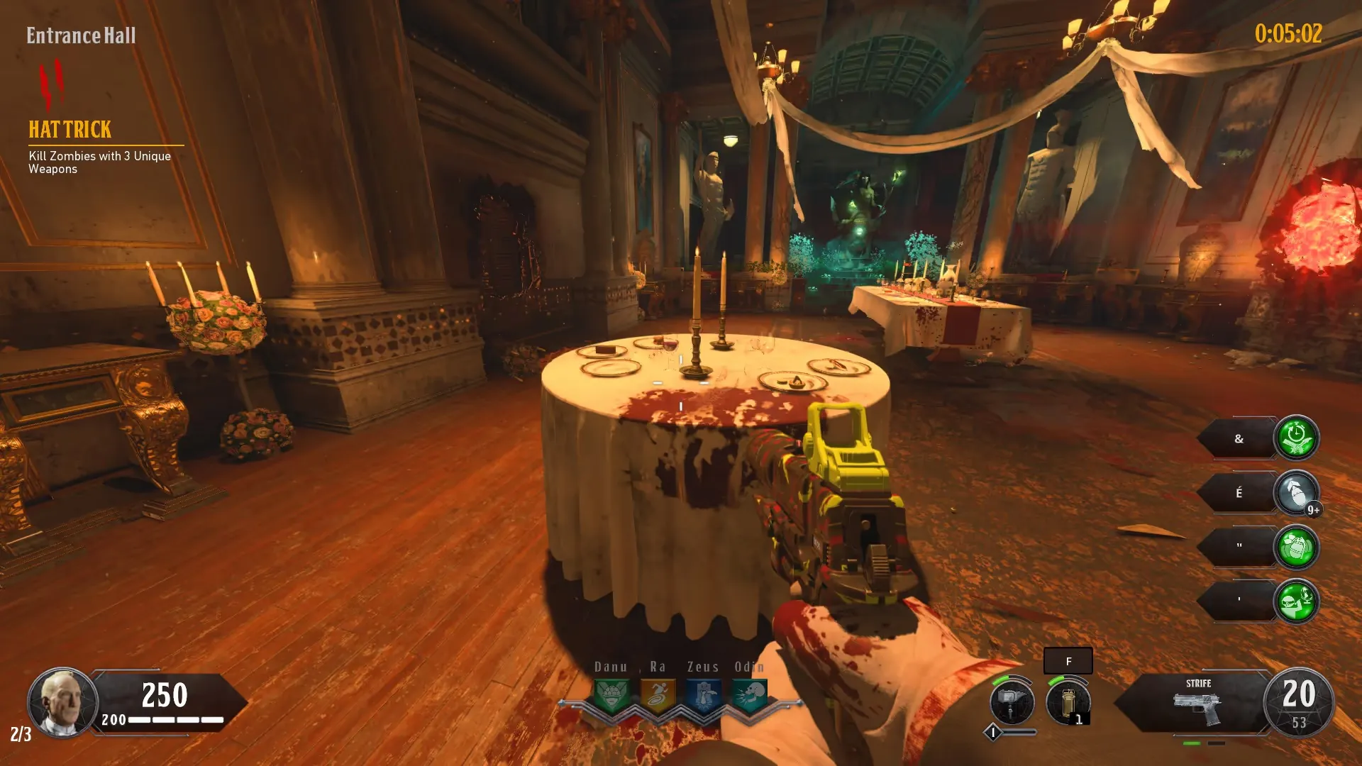 Head to the Library, turn on the Fire Trap, and shoot the flames with Alistair's Annihilator until the flames are blue. Once blue, pull out your shield and run through the flames to ignite your shield. You now need to melee four fireplaces within 45 seconds to turn them blue. This needs to be done for three sets of four fireplaces, each set rewarding you with a Gem.