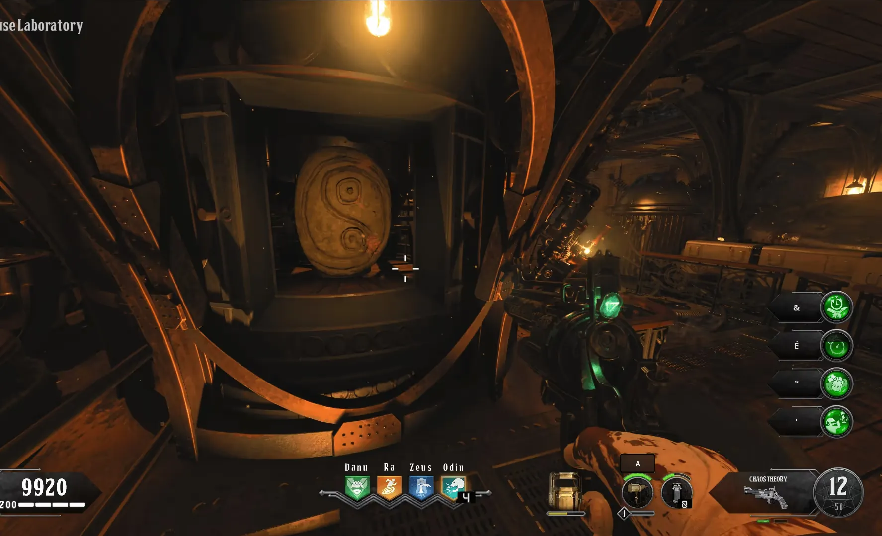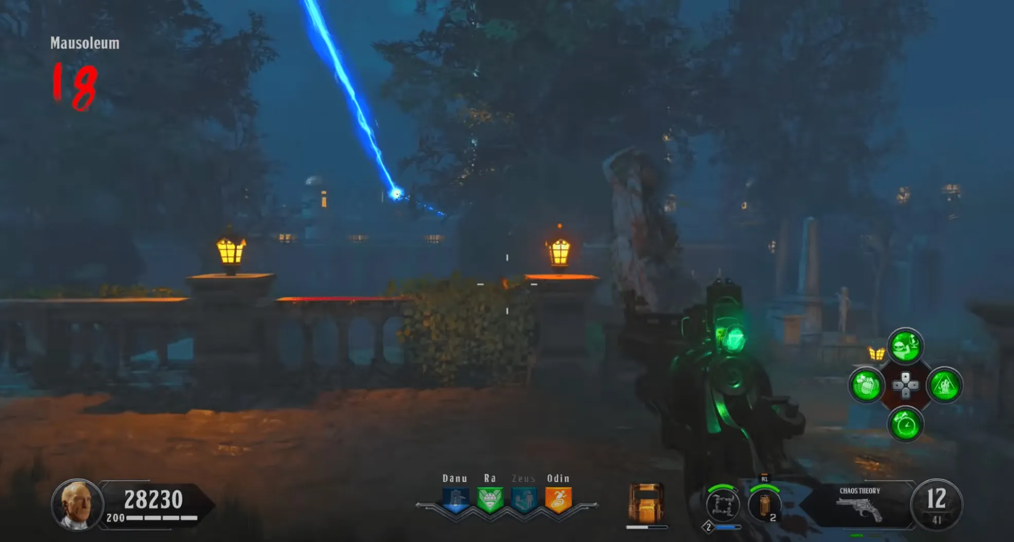 Inside the Cemetery along the railings of the stairs to the Mausoleum, there will be lanterns that are lit up, most are lit up yellow but one is going to be lit up with a slightly orange tint. You must find the orange lantern and shoot it with the Chaos Theory, doing so will cause the lantern to go dark and you must repeat this for three more lanterns.