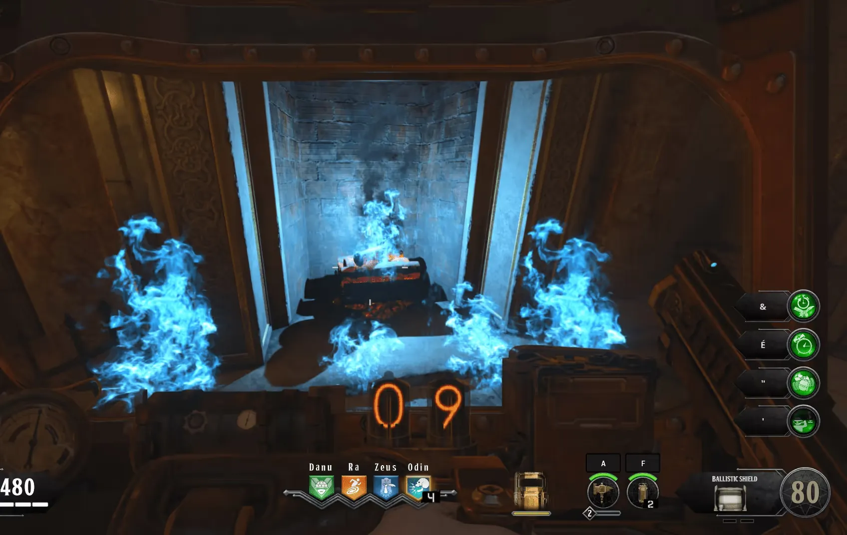 Once the gems have been embedded into their symbols they will summon ghost knights that act as soul boxes where you must kill zombies near them to fill it. Each knight must be filled twice, moving closer to Pack-a-Punch each time they are filled. Once all three knights are in front of Pack-a-Punch they will form a triangle and a Werewolf will spawn. You must kill this Werewolf within this triangle, spawning a big stone slab.
