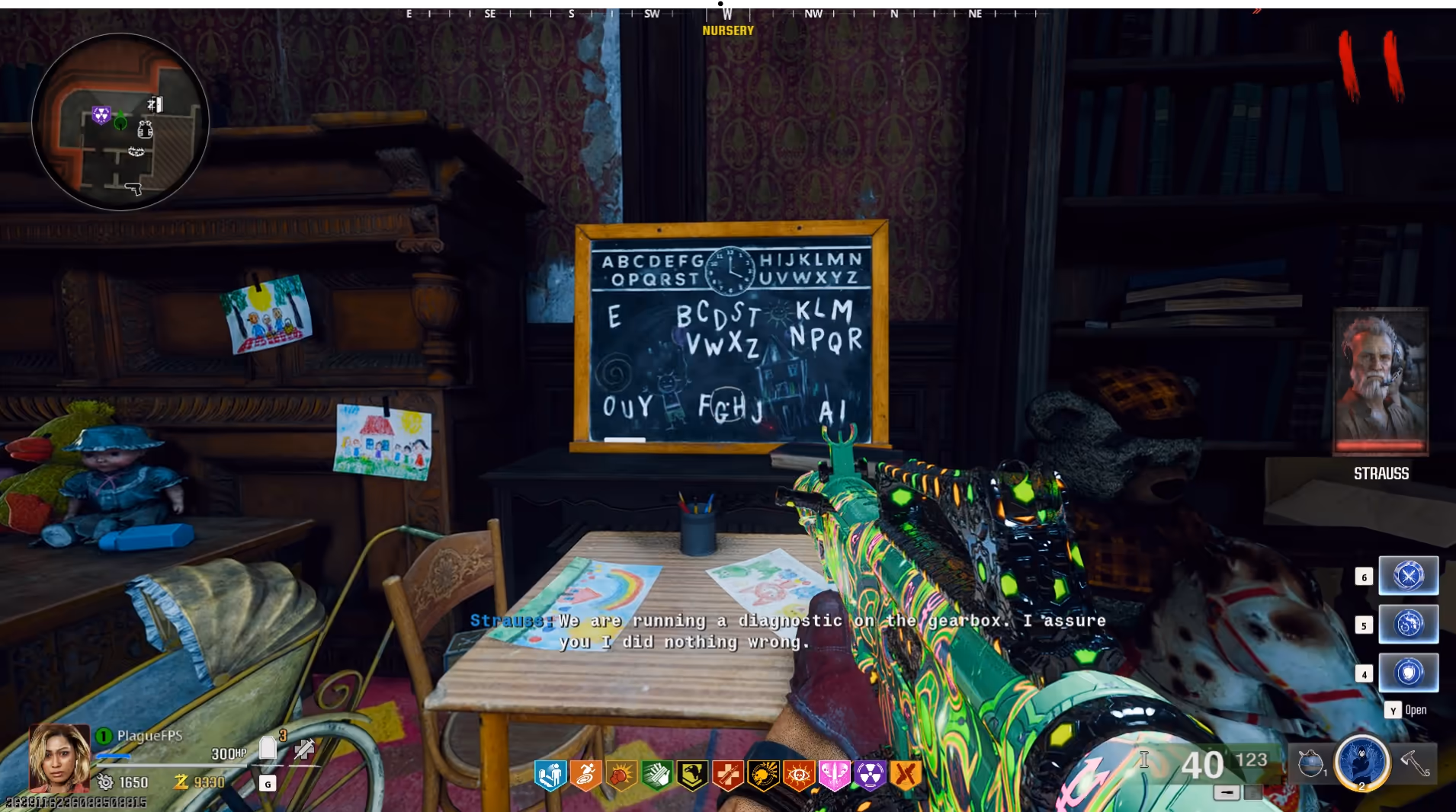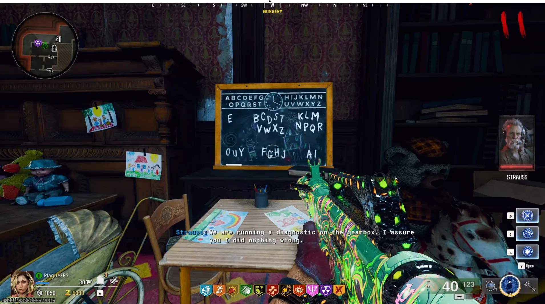 Once the sheet is done printing, interact with it to read the document containing a four-letter protocol name being either CRAB, WORM, MOTH, or YETI. Afterward, head to the Nursery to find a chalkboard with six groups of letters on it. You must find the group of letters that contains each letter of your protocol and then count the letters in that group to get a digit of the four-digit code needed.