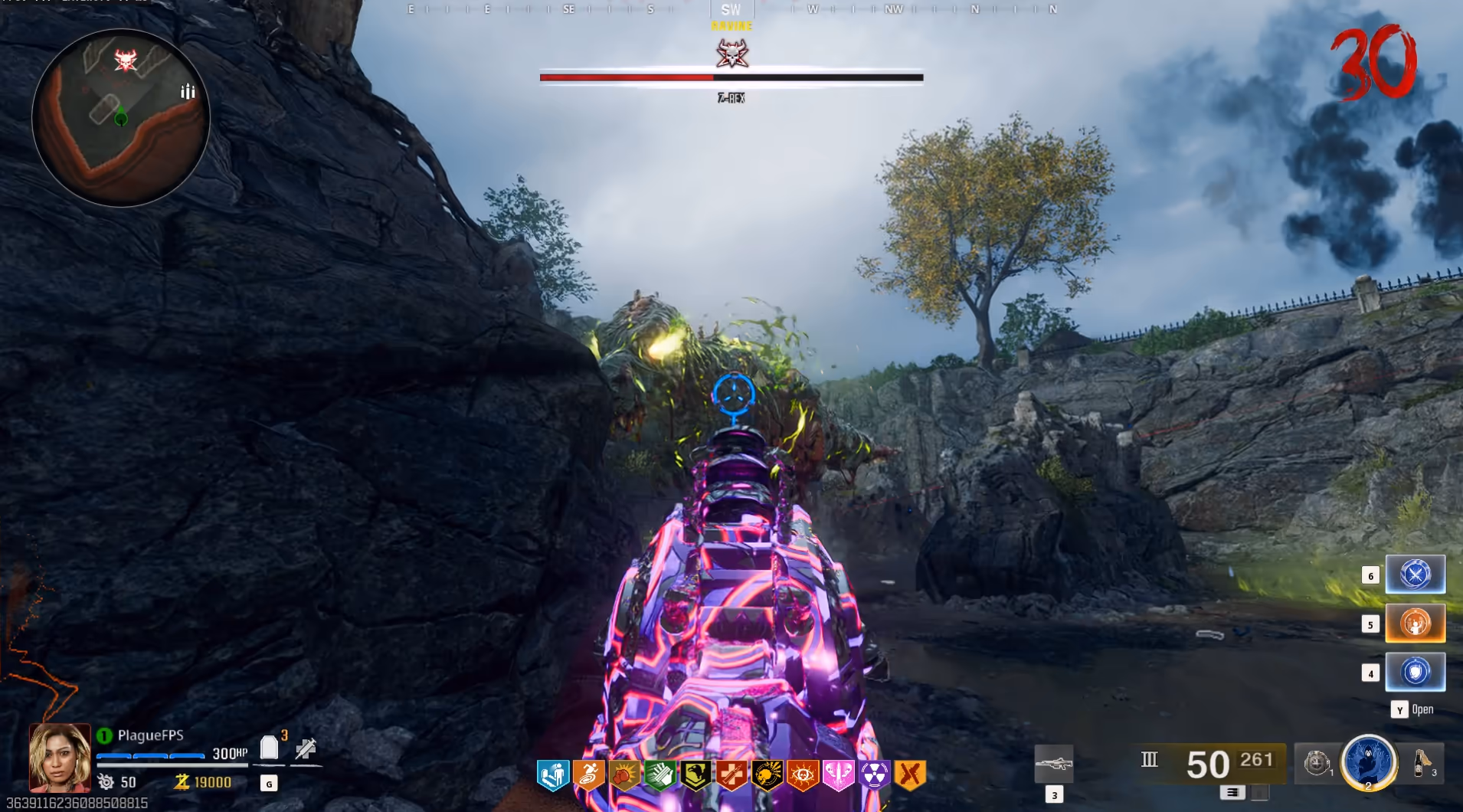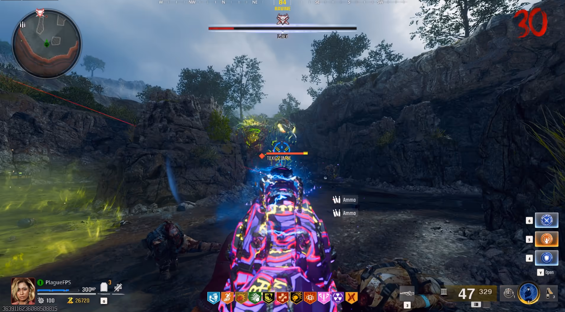 During this entire boss fight, you must be doing three main things, killing zombies for ammo, avoiding toxic pools, and keeping distance from the Z-Rex. If you can maintain those three things, you will be able to defeat this boss. Always look to damage Z-Rex when it is on the other side of the arena from you or if it has the toxic zombies on its sides.