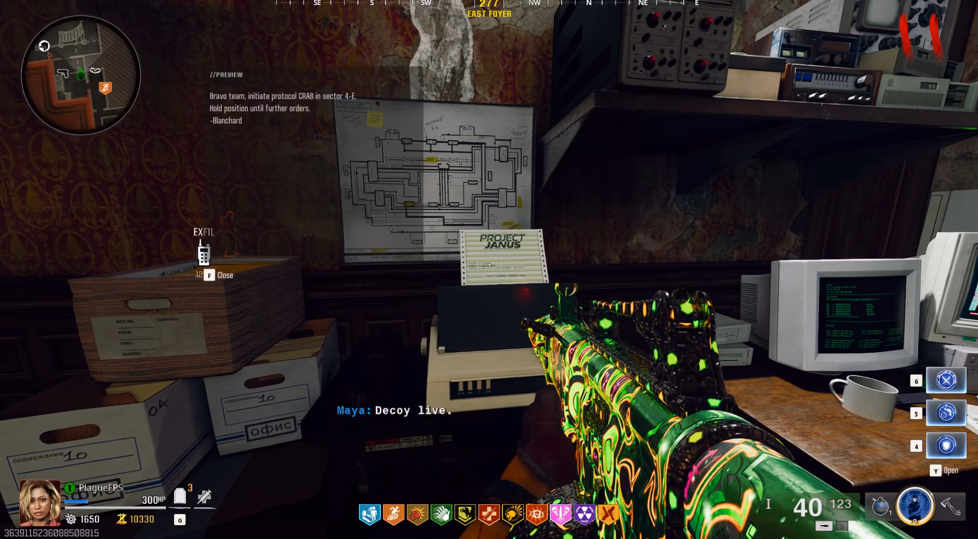Progress until Round 10, once completed, you'll need to wait for a Lab Technician zombie to spawn in the Mainframe Chamber, who, once killed, will drop the Floppy Disk needed to gain information on the code needed to obtain the next part.