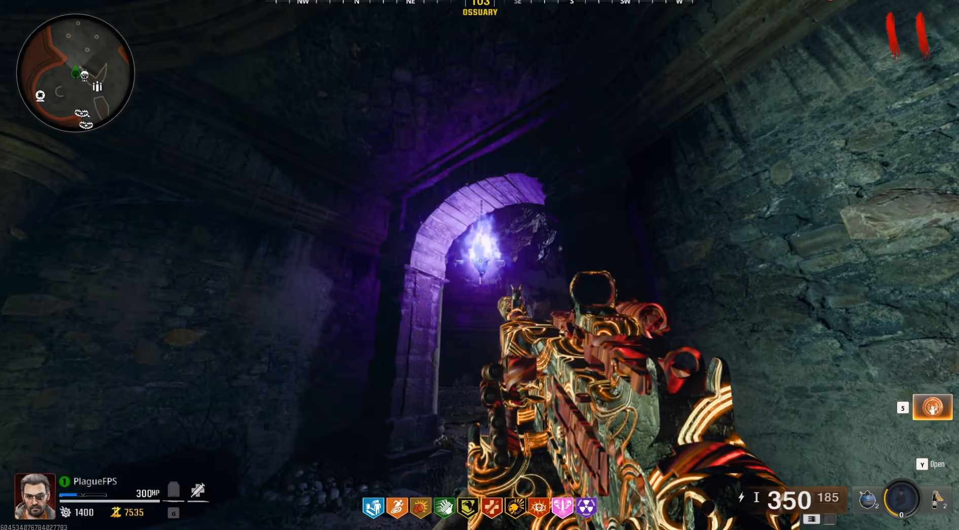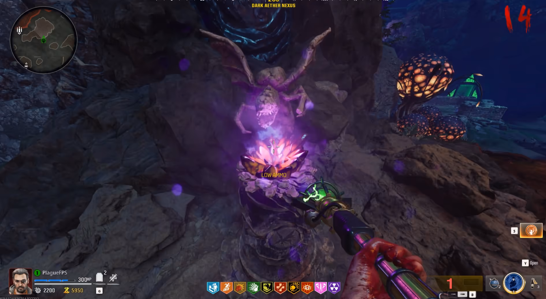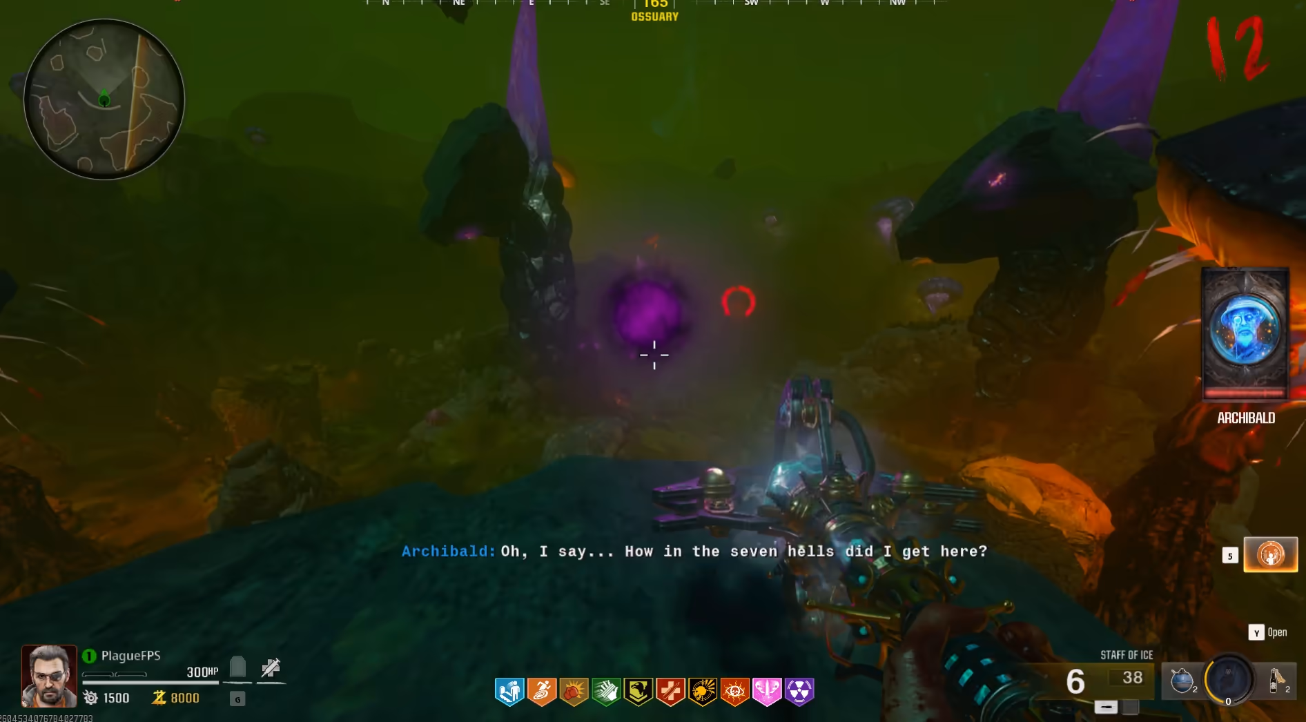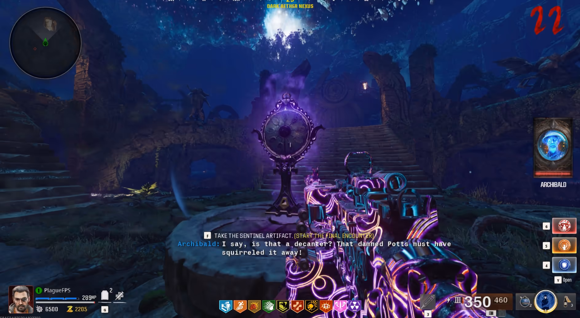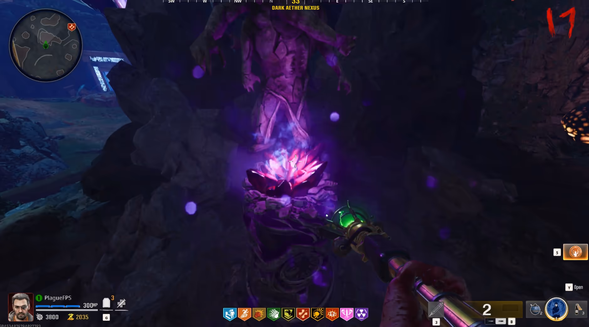After interacting with the purple orb, it will lower and begin a route around the Dark Aether Nexus. All players must stay near the orb, killing all zombies that spawn to fill the orb with souls until it has reached the structure in the center of the area and entered inside it. Once the orb is inside the structure, interact with the orb to upgrade the Staff of Ice into Ull's Arrow.