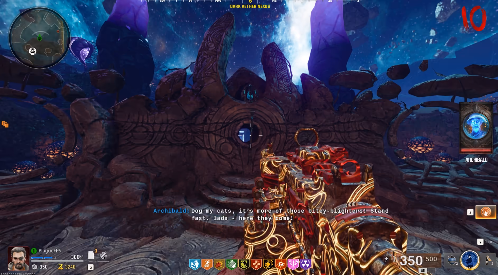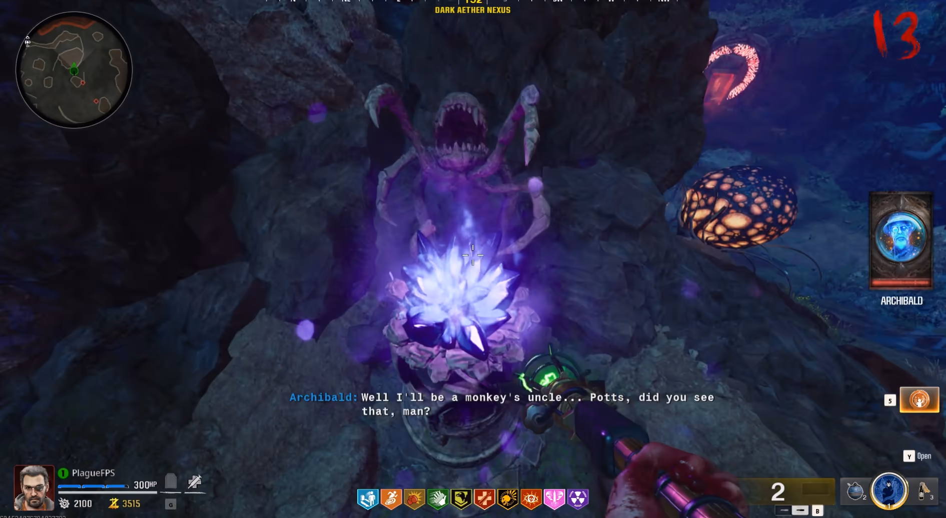 Interact with the pedestal underneath the glowing archway to build a bridge to the boss arena. This will despawn all the zombies and will only respawn them, continuing the rounds if you leave the Dark Aether Nexus or cross the bridge to the arena.