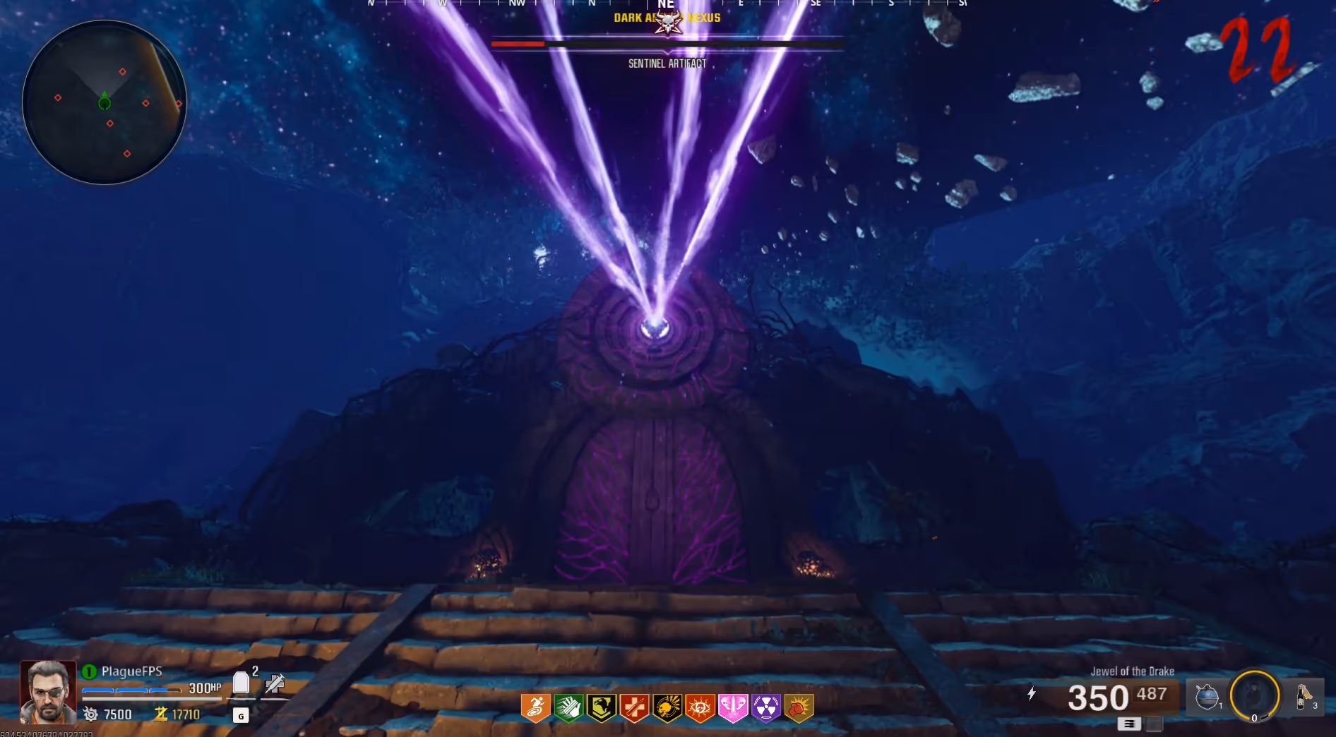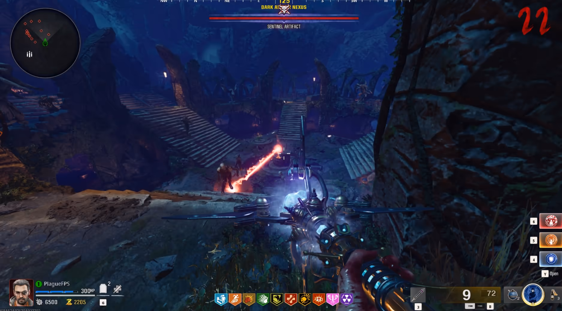 The Sentinel Artifact is the boss of this map and only has one attack, that being a laser that emits from the front of the artifact as it spins around in a circle. Simply avoid this laser by continuously rotating around the arena or by hiding behind the natural cover of the map underground.