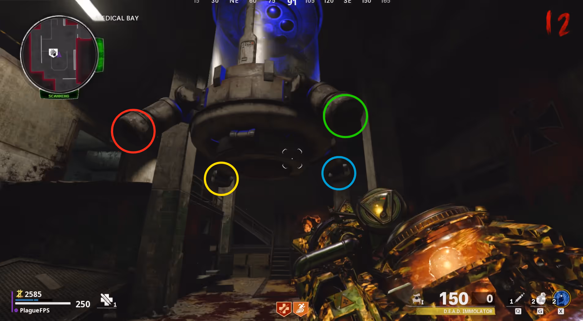 Head to the Medical Bay and use all four variants of the D.I.E. Shockwave to shoot each of the legs of the Decontamination Chamber hanging in the Medical Bay. Each leg has a colored ring matching the variant of the D.I.E. Shockwave that needs to be shot at it; Electrobolt (Yellow), Thermophasic (Red), Cryo-Emitter (Blue), NOVA-5 (Green).
