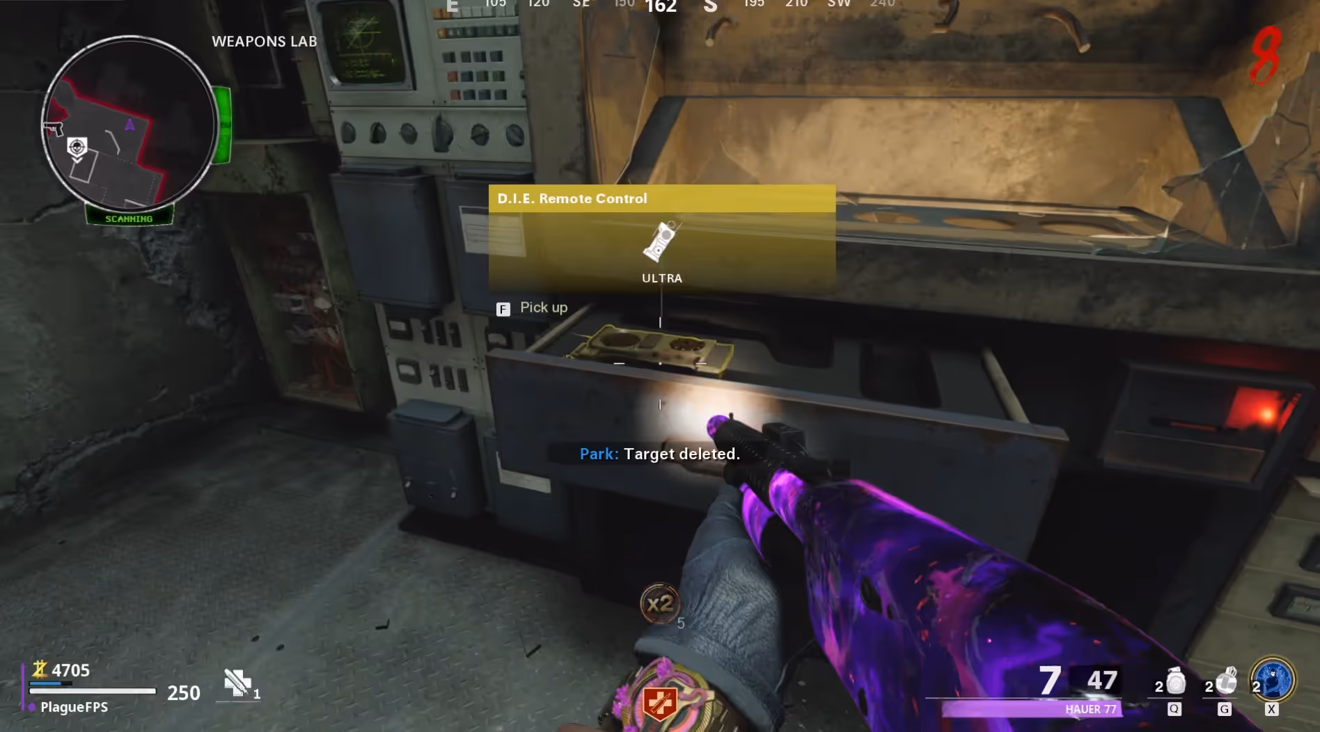 Wait for a Megaton to spawn and kill it and its split forms. After killing the final form a golden Keycard will drop on the ground that you must interact with to pick up. Bring this Keycard to the Weapons Lab and interact with the Weapons Locker, which contains a blinking red light, to obtain the D.I.E. Remote Control.
