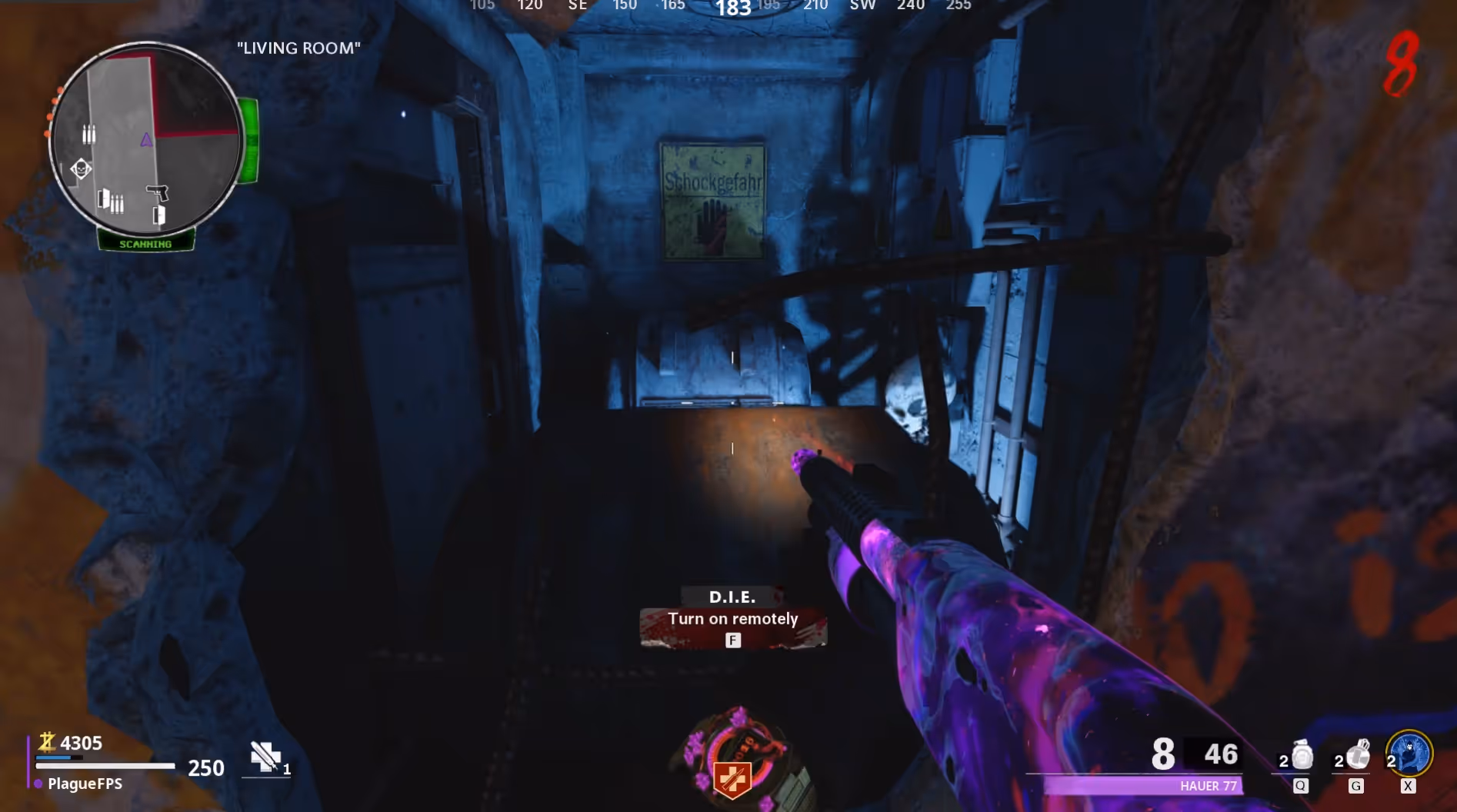 Once you have the D.I.E. Remote Control, head to the Living Room inside the Nacht Der Untoten building where you will be able to activate a D.I.E. Shockwave that is stuck inside a locked room with a hole in the wall. Gather up some zombies, activate the D.I.E. Shockwave, and lead them into the suction to charge the weapon.