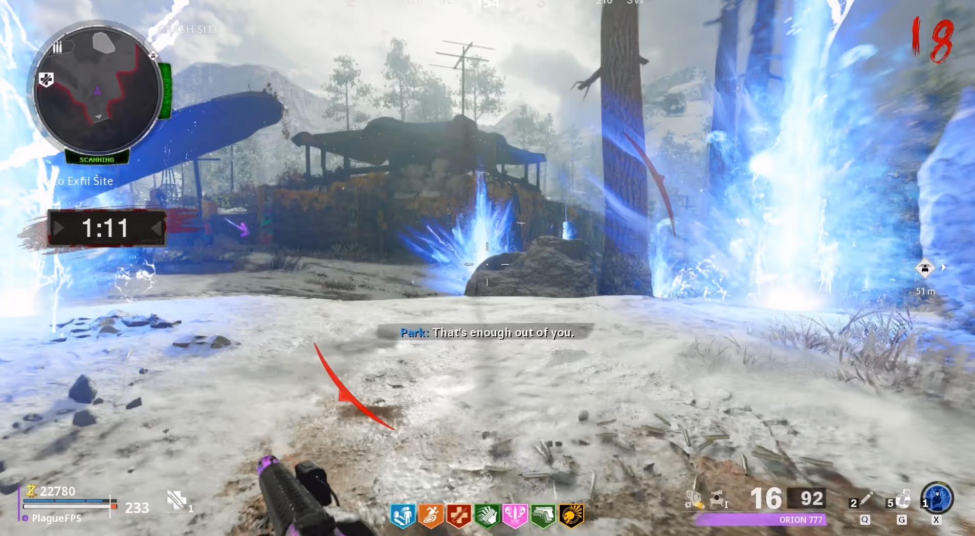 Once you have successfully defended Orlov, the screen will go white and the map will begin to break down as electricity starts shooting from the ground. You now have 1 minute and 30 seconds to get to the exfil chopper located in the Pond area of the map without touching any of the electricity or you will instantly go down.