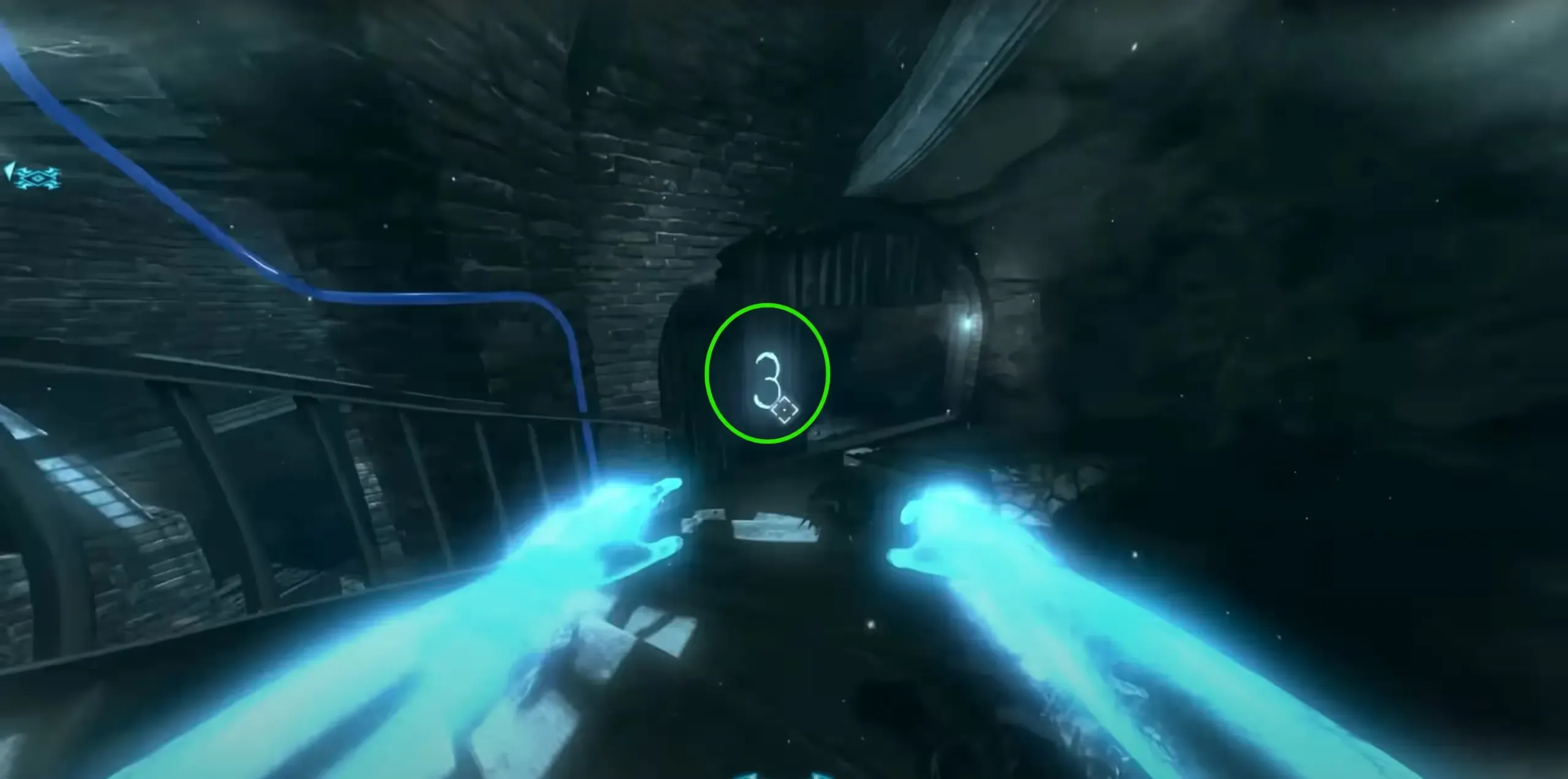 After unlocking this number pad, one player will need to enter the afterlife at the top of the spiral staircase and make their way down to the number pad, on the way down you'll see three big blue numbers on the left-hand side walls before reaching the bottom. These numbers have to be entered into the number pad by shocking each of the Volt Meters until it reads the correct 3-digit code.