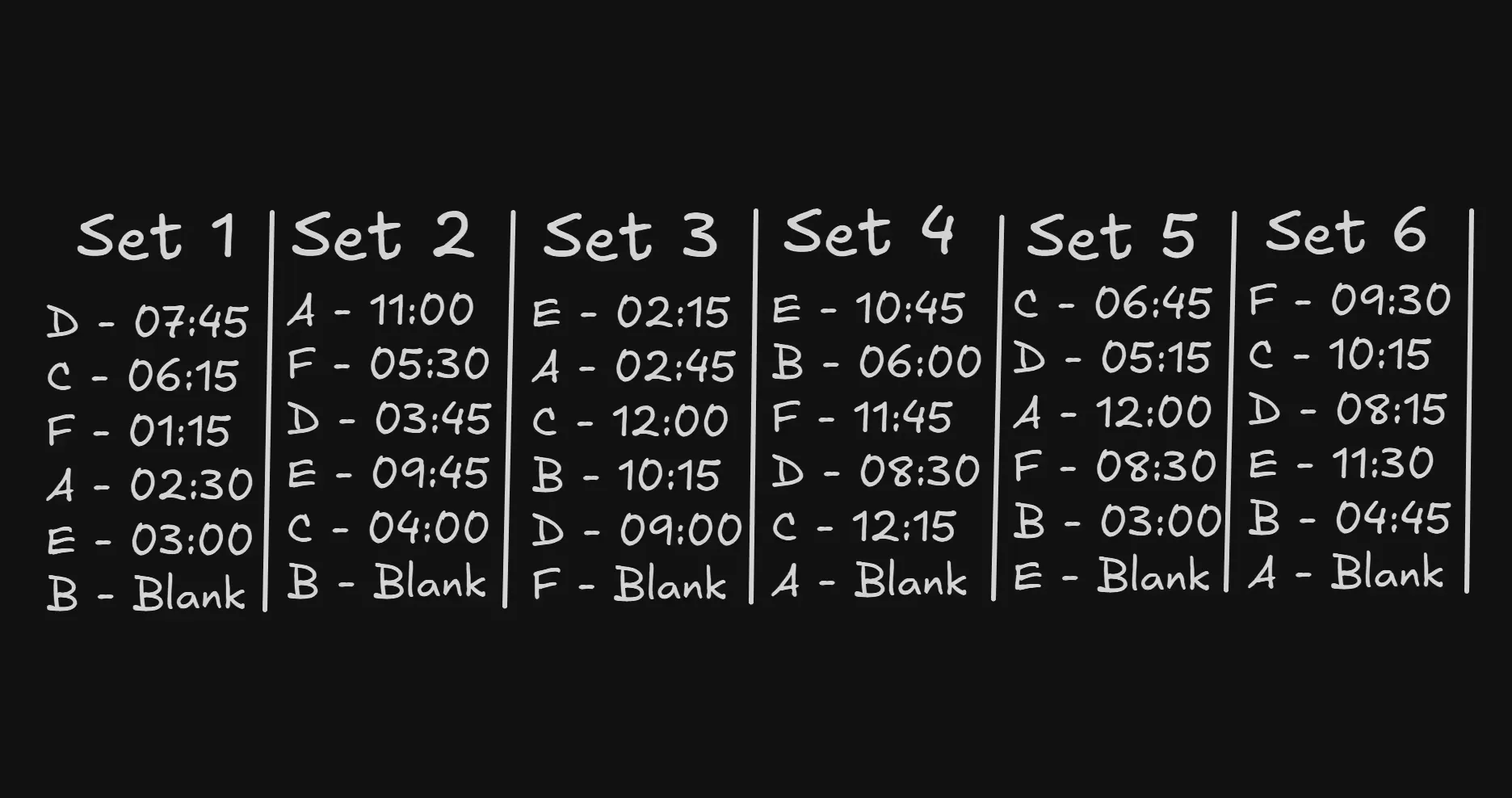 Luckily, you only need to remember the first code as there are only six possible sets of times, shoutout to GregFPS for figuring this out. Take your first code and use the image below to find which set starts with your code and now you have all five codes without having to listen and remember them from the TV.