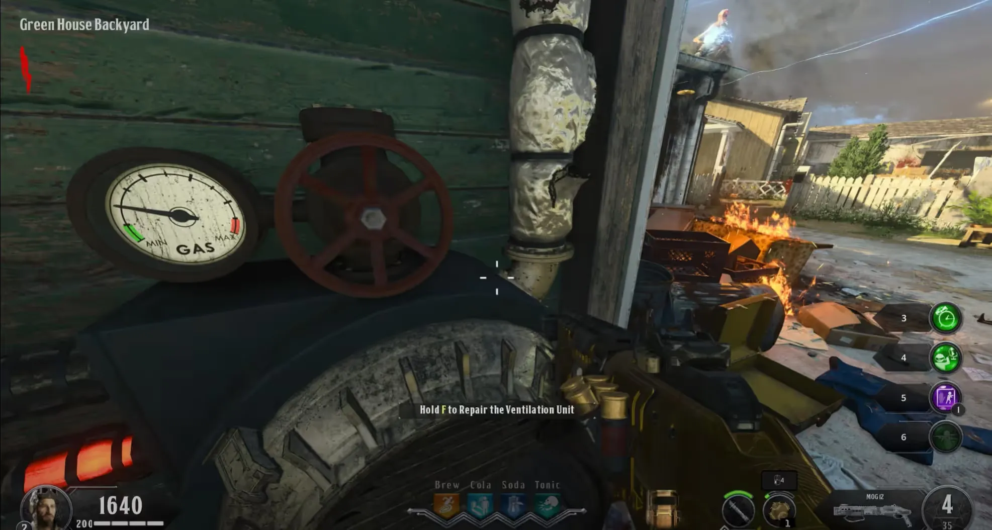 Turn on the power in the Power House and head to the Generators area to activate the generator and initiate a lockdown. After the lockdown, four of the six houses around the map will be emitting Nova-6 Gas, and you must repair the Ventilation Units in those houses by holding the interact button until the gauge is back to green.