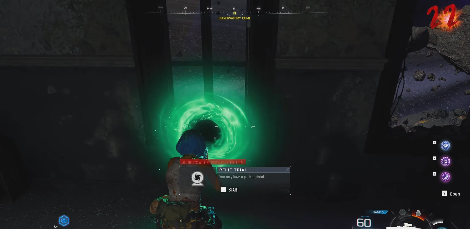 If done correctly, you will hear Mister Peeks laugh and the relic trial portal will spawn in the Observatory Dome for you to enter. This relic's trial is: "You only have a Pack-a-Punched pistol."