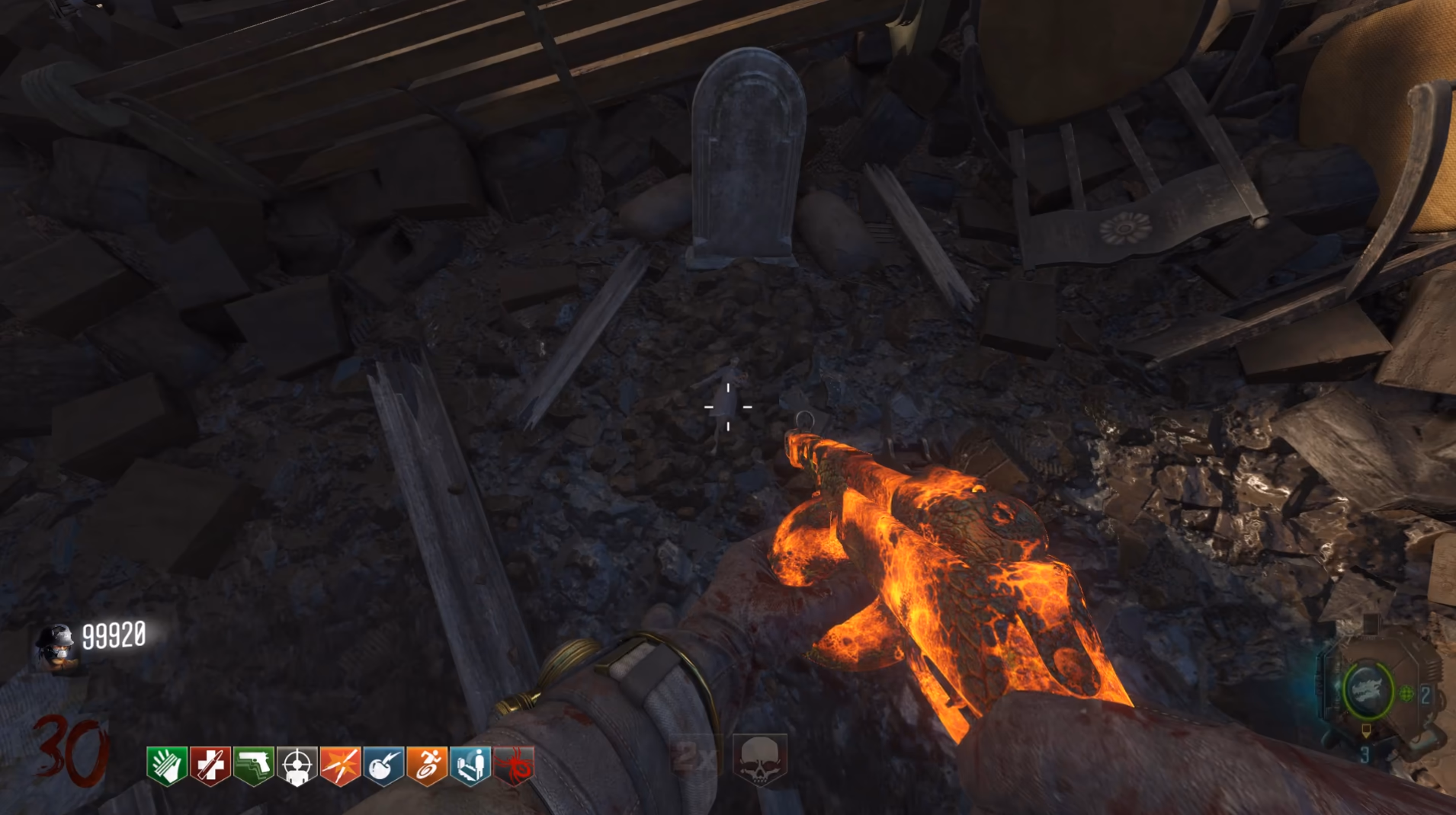 This side quest has players throw a Monkey Bomb into Dragon Fire at any unique areas of the map, activate a Samantha Doll in spawn, find and shoot five different Samantha Dolls within 30 seconds of each other, then interact with the Samantha Doll in spawn again to get a Max Ammo Power-Up, which once picked up will activate the music easter egg song "Samantha's Sorrow".