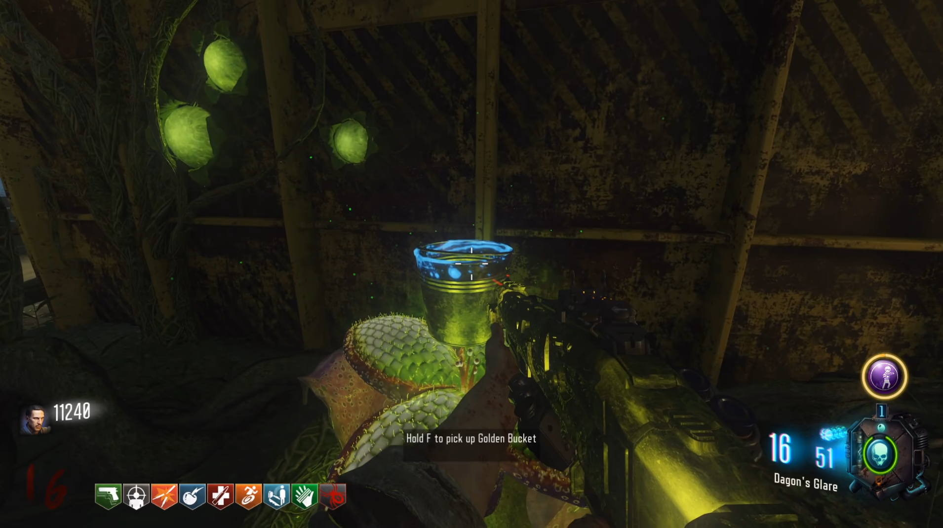 This side quest has players grow every type of plant possible on the map, then use the Skull of Nan Sapwe to mesmerize some vines under Lab B, revealing a growing spot that you can place your bucket onto, revealing three nearby growing spots that you must plant seeds into to grow carnivorous plants, that you must feed zombies too, to obtain the Golden Bucket.