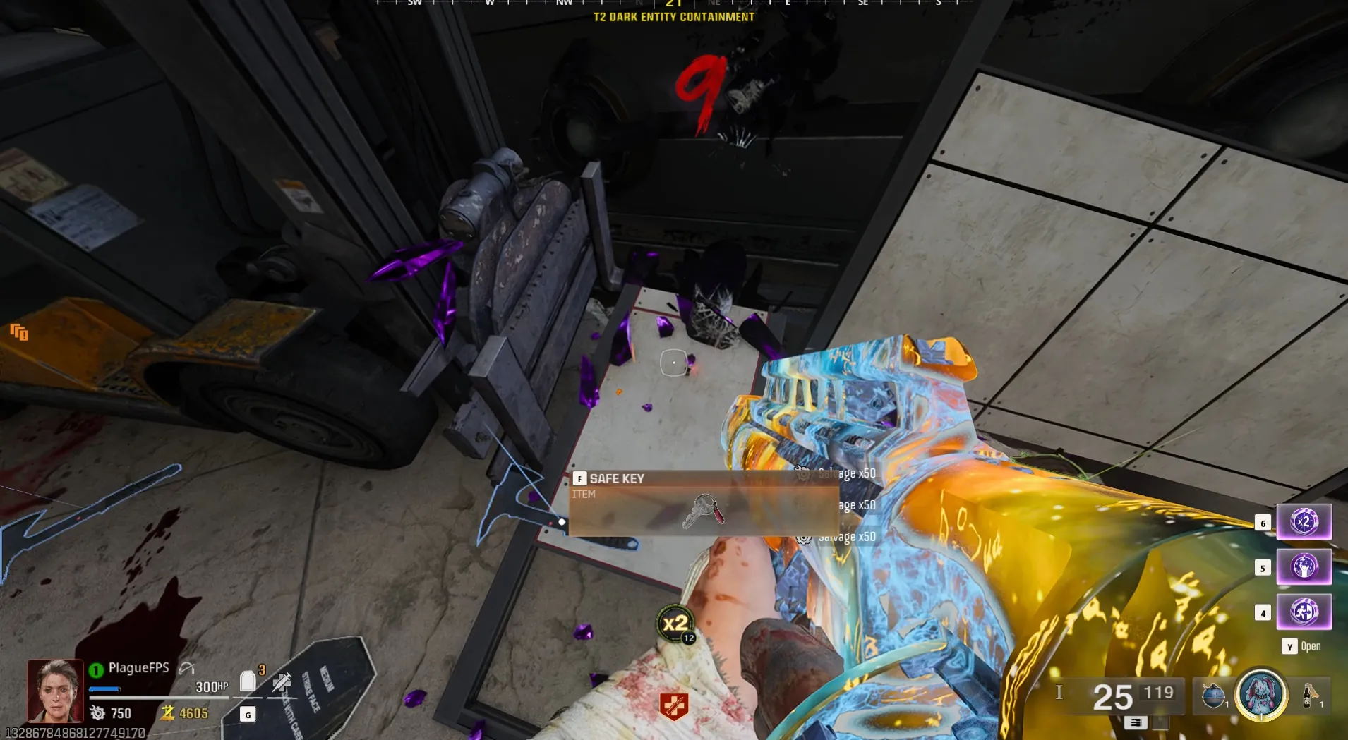Upon detonation, an LT53 Kazimir-like portal will spawn and start moving up the Dark Entity Containment, spawning in a bunch of Aether Crystals that you must destroy, dropping the Safe Key that you can interact with to pick.