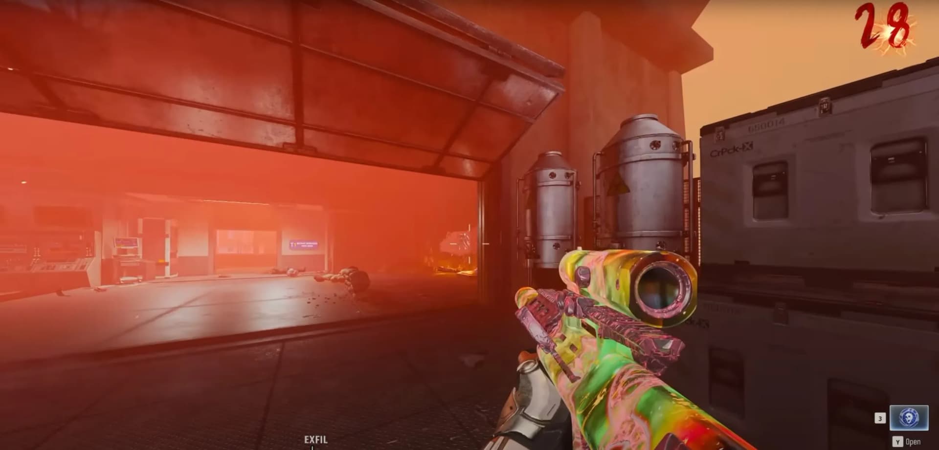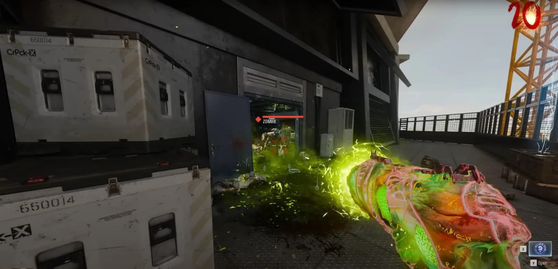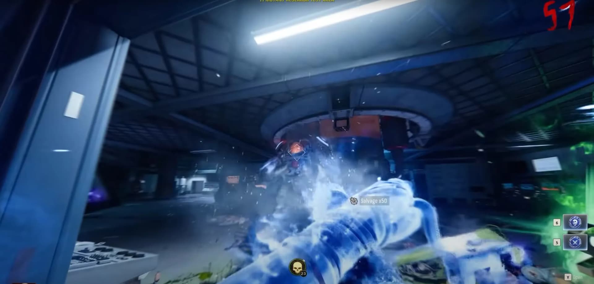 Head to the T1 Mutant Research Lab mystery box location, where you'll camp on the outside section, spamming the charged shot of the Gorgofex Necrodystonia at the door to kill zombies. Once you reach around rounds 40-50+, you'll need to utilize Shock Charges to stun the horde of zombies and primarily the Doppelghast coming through.