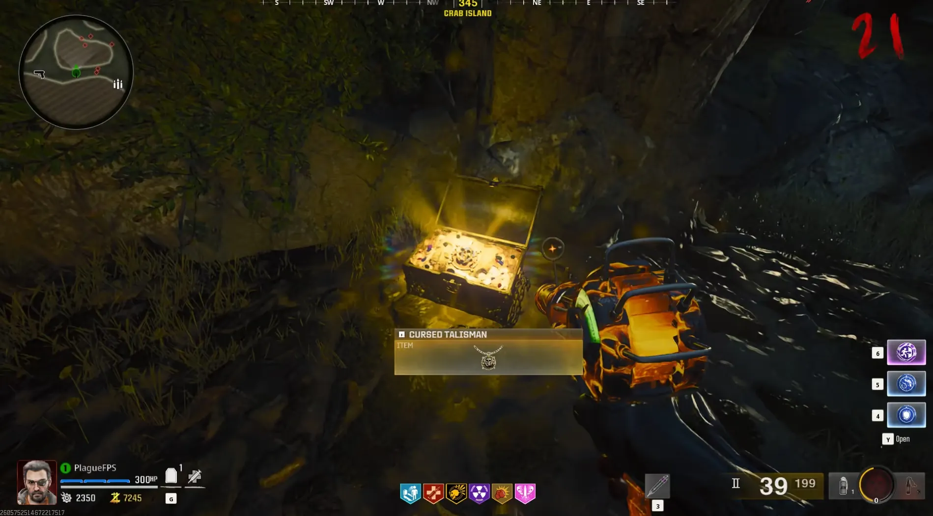 Progress about three rounds until a storm can be seen on Crab Island. Head to the island to find a golden glowing chest that you can interact with, opening it and revealing the Cursed Talisman for you or anyone in your game to collect, granting you permanent Double Points with the curse of losing points when hit by zombies.