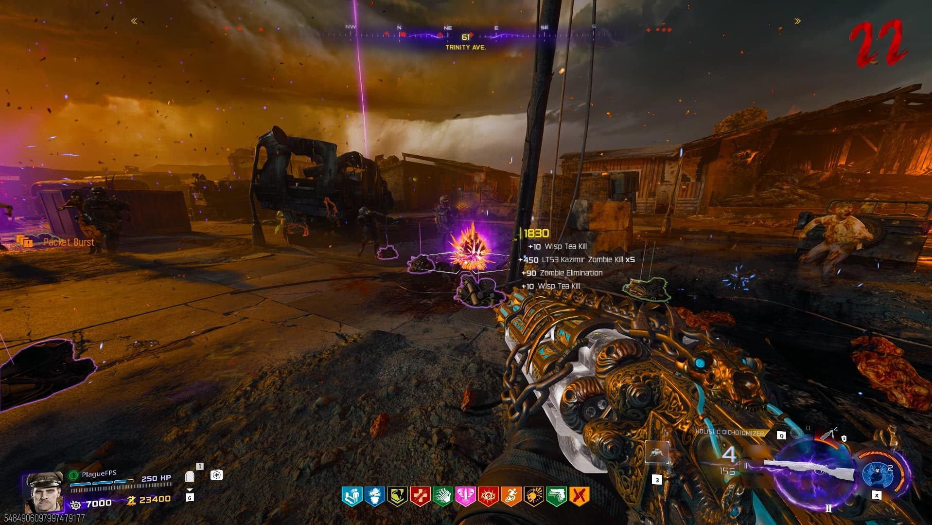 Once you have all seven items, place all seven down at the Purple Cyst by interacting seven times, then hold interact once all seven are placed to have the cyst eat all the items. Once eaten, the cyst will now be a soul box which you must fill, and once filled, it will spawn four HVTs: Heavy Zombie, Rad-Hound, Shock Mimic, and Doppelghast